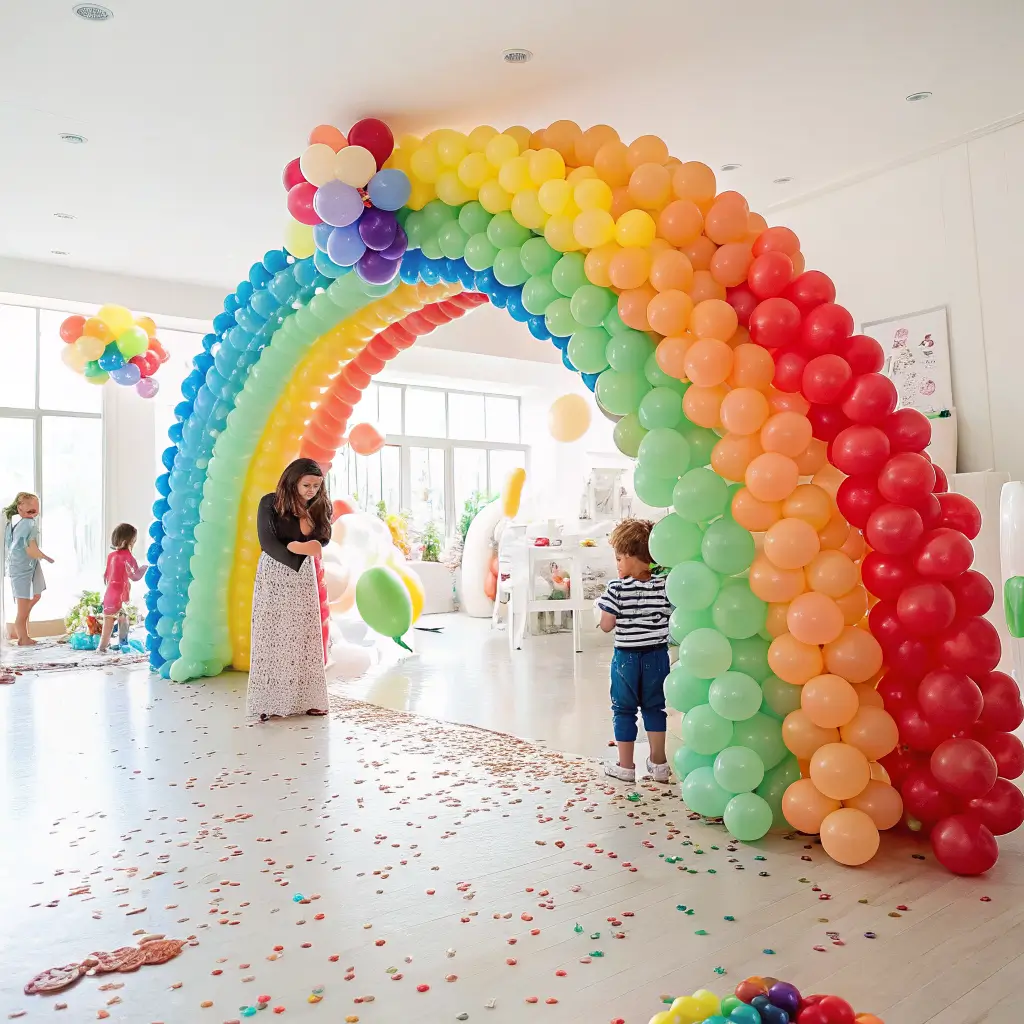 Let’s start with the showstopper that never fails to impress – the rainbow balloon arch. This isn’t your basic party store garland; we’re talking about a full-spectrum masterpiece that’ll have guests doing double-takes.