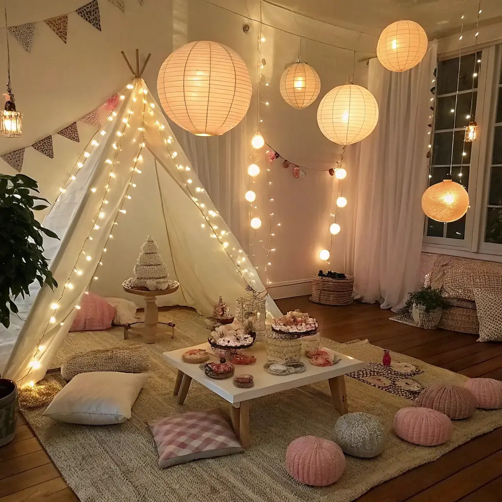 Nothing says “magical evening” quite like dining under a canopy of twinkling lights. This theme transformed my backyard into something straight out of a fairy tale, and the setup was surprisingly simple.