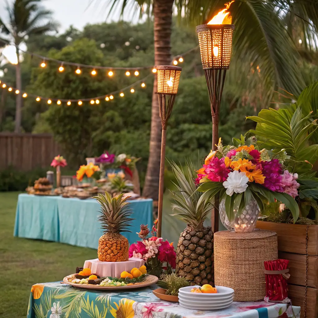 • Fun accessories: Tiki torches, grass table skirts, and colorful leis