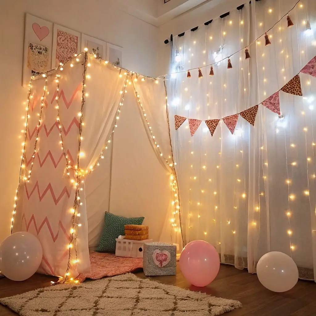 Every great birthday setup needs one thing: a spot where people immediately say, “Wait, take my picture here.” That’s where a fairy light photo corner comes in. It creates a cozy focal point, adds soft lighting, and gives the room a dreamy glow that flatters basically everyone.