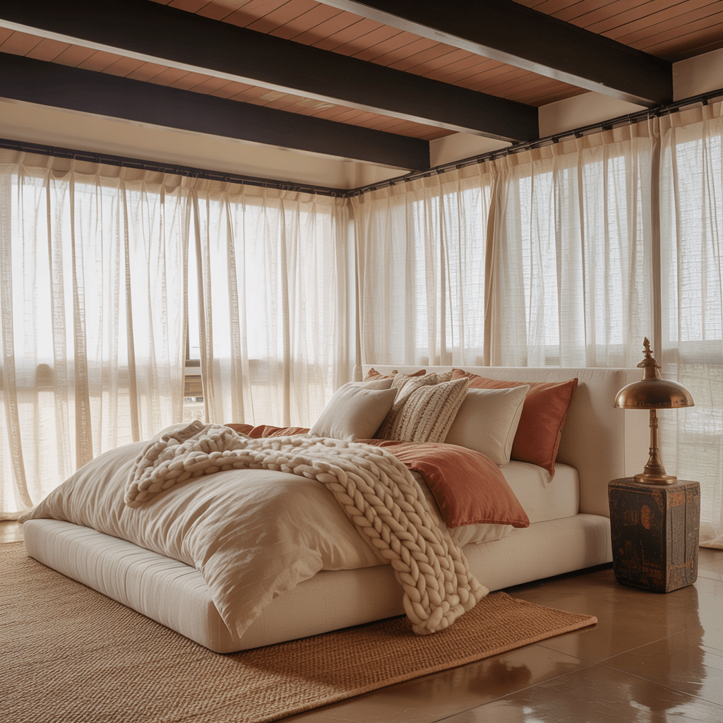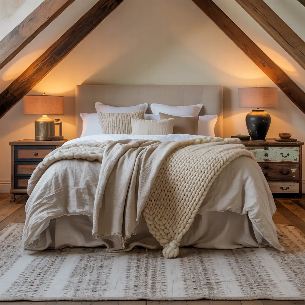 Start with reclaimed wood furniture – the more character, the better. I found my headboard at a salvage yard (best $150 I ever spent), and it brings so much warmth to the space. Pair it with black iron bed frames or lighting fixtures, and suddenly you’ve got this perfect industrial-rustic mashup.