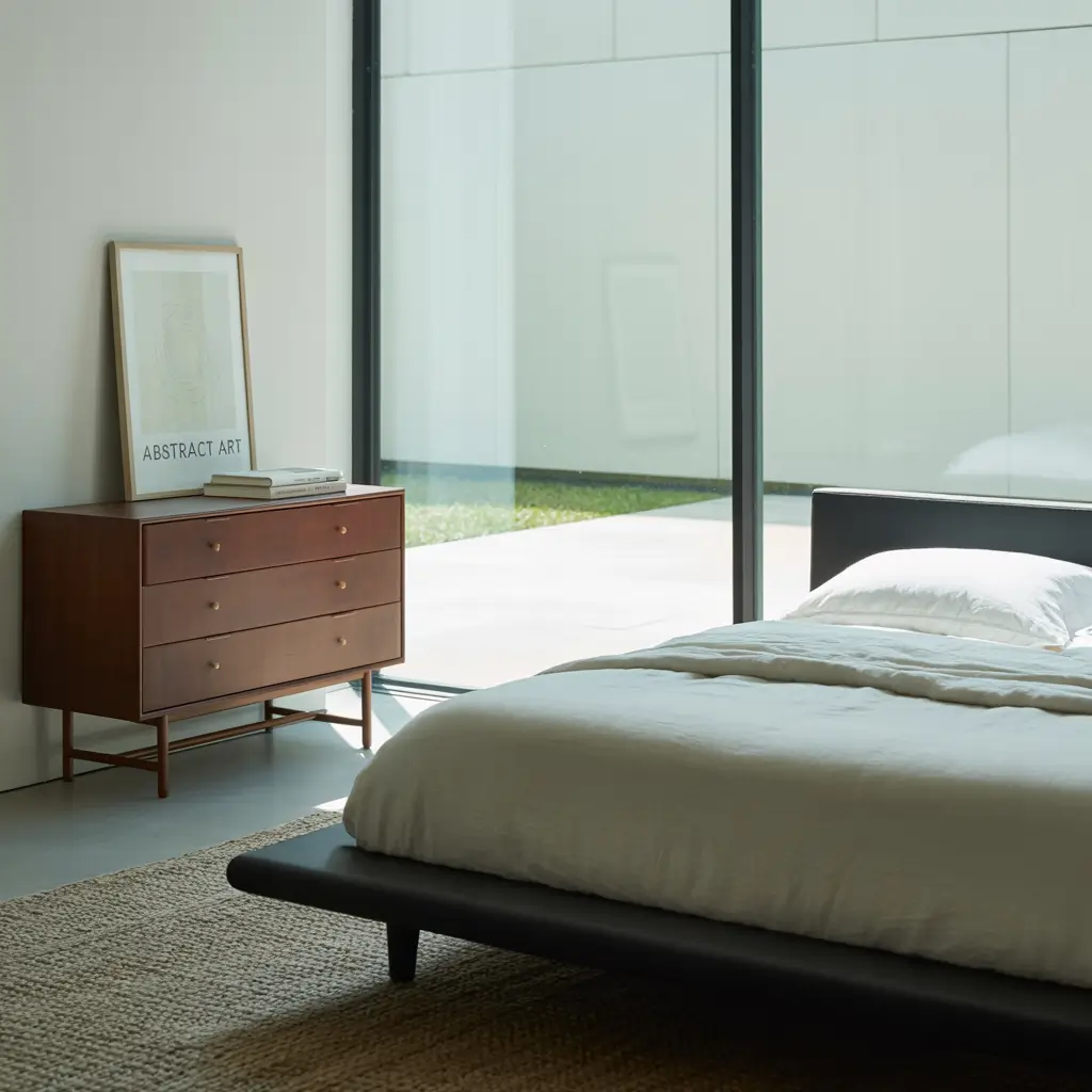 Go for a platform bed in dark wood or matte black metal. Keep nightstands floating and simple – maybe just a shelf or two. The dresser? Low profile, please. Everything should feel intentional and uncluttered.