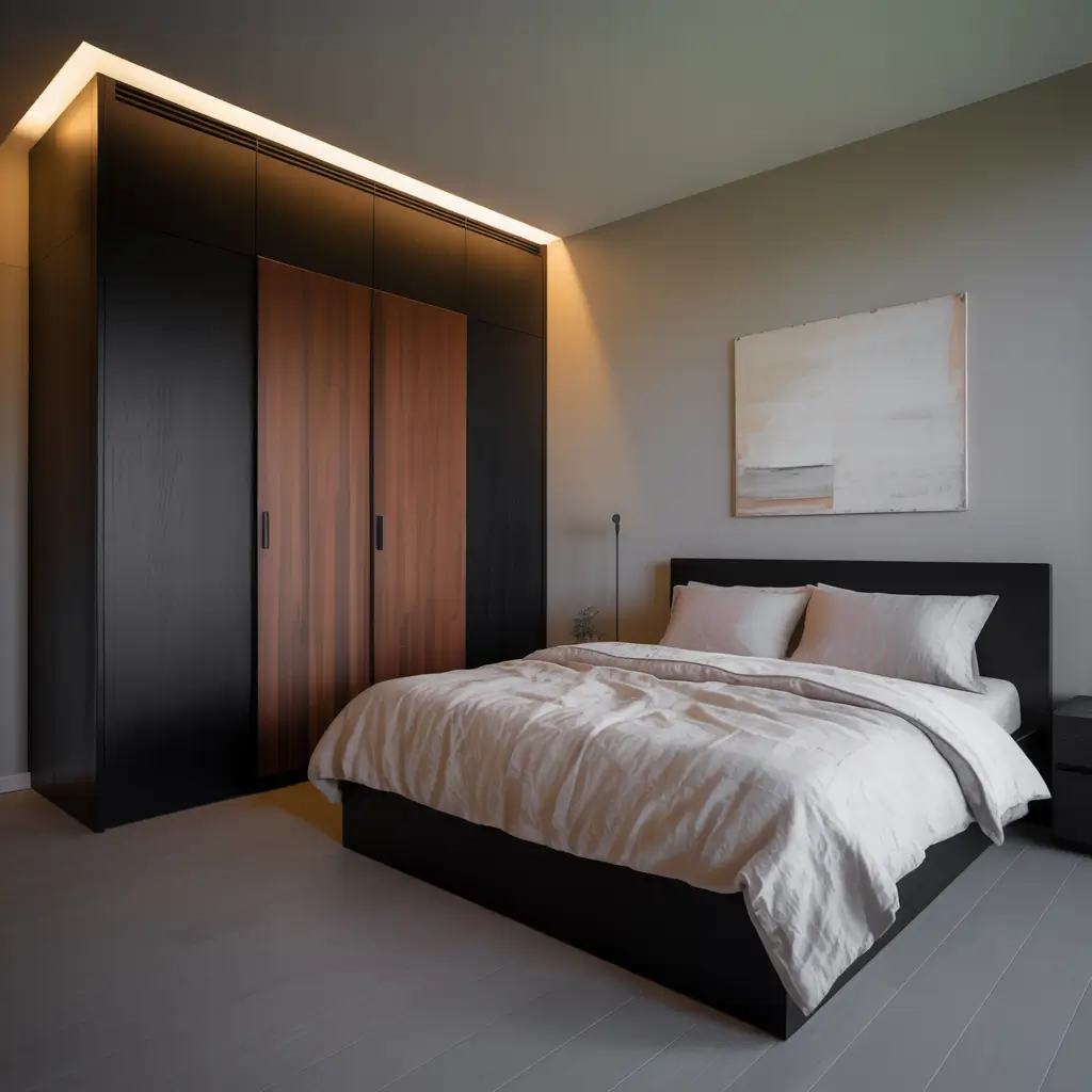 Storage doesn’t have to be boring. A black wardrobe with brown sliding doors becomes a design feature, not just furniture. Plus, sliding doors? Game-changer for small bedrooms.