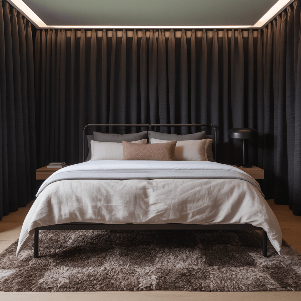 Window treatments and rugs might seem like afterthoughts, but they’re actually the unsung heroes of bedroom design. Black curtains with a brown rug ground your space and define the color story immediately.