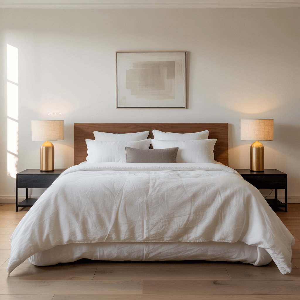 Focus on clean lines and quality over quantity. A simple black platform bed, one gold-framed piece of abstract art, maybe a single gold accent lamp. Each piece should feel intentional, like it earned its spot in the room.