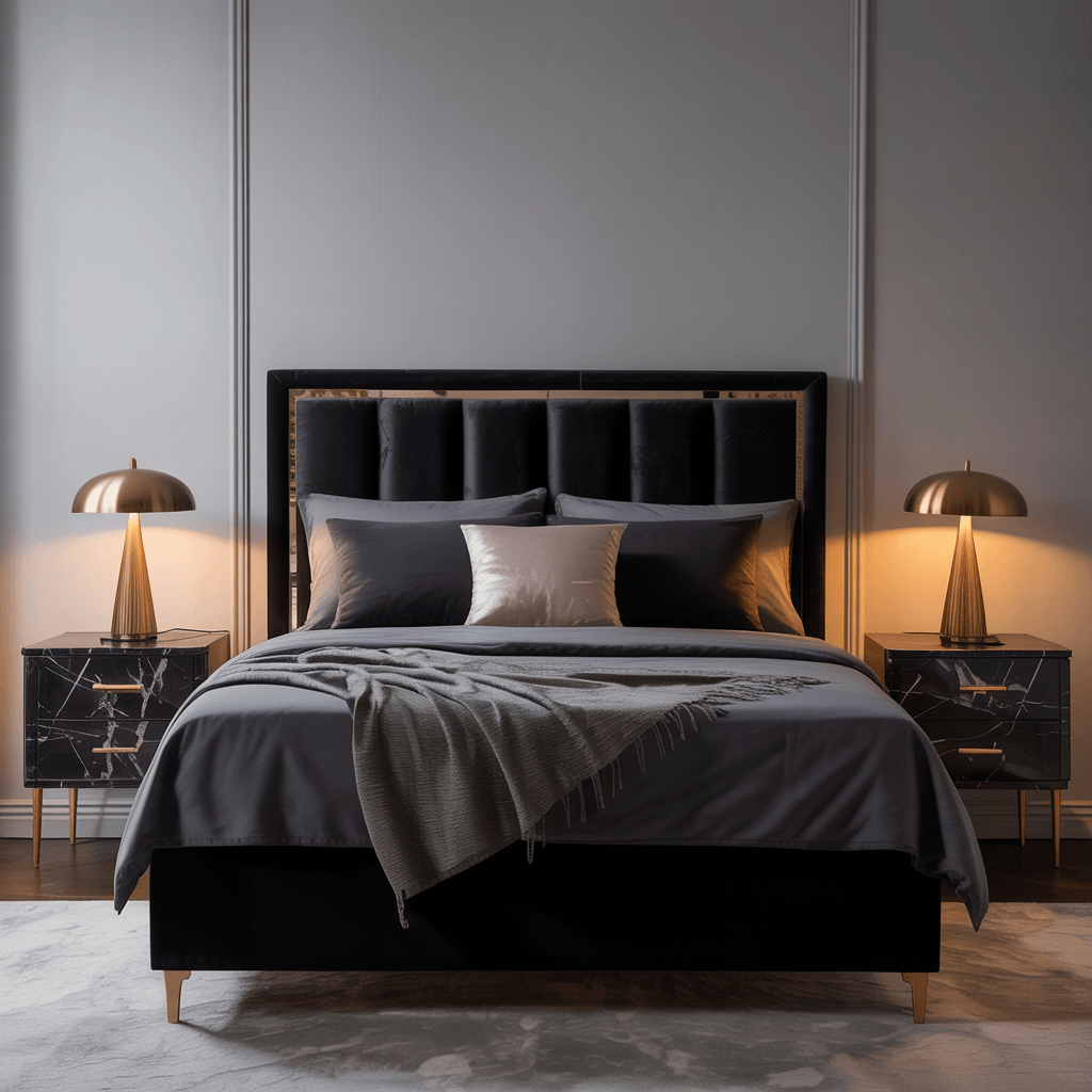 Black Velvet Bed with Gold Accents