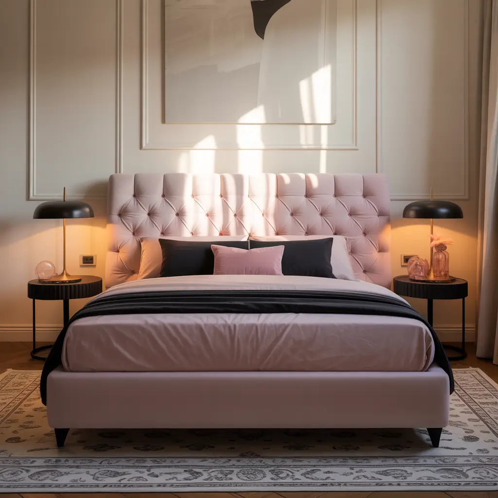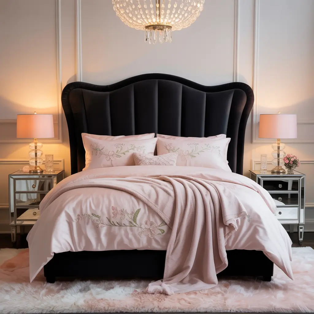 Here’s a plot twist – start with a statement pink headboard and build your black elements around it. This reverse approach creates a feminine foundation that the black decor enhances rather than overshadows.