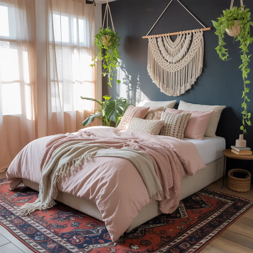 I helped my best friend create this style in her studio apartment, and the transformation blew my mind. We kept classic boho elements – macramé wall hangings, layered textiles, plants everywhere – but executed them in our color palette. The result? Pure magic.