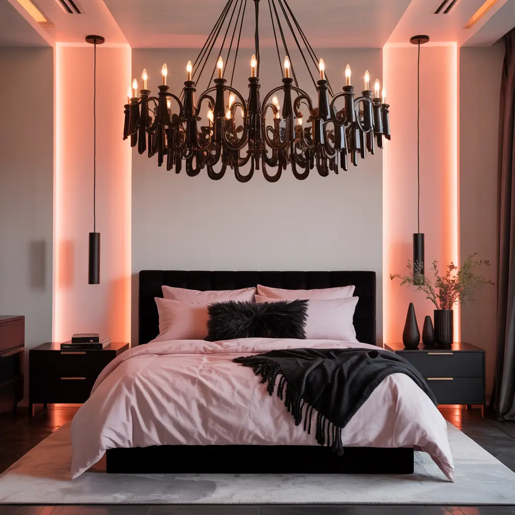 Lighting can make or break your bedroom design, and black chandeliers with pink bulbs or shades create pure magic. This combination casts the most flattering light while adding serious style points to your ceiling.