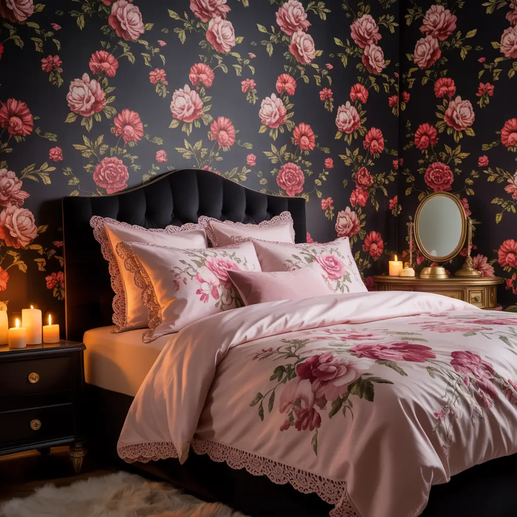 Florals don’t have to mean grandma’s guest room. Black backgrounds with pink floral patterns create this moody, romantic aesthetic that feels fresh and modern. Think less English garden, more midnight botanical dream.