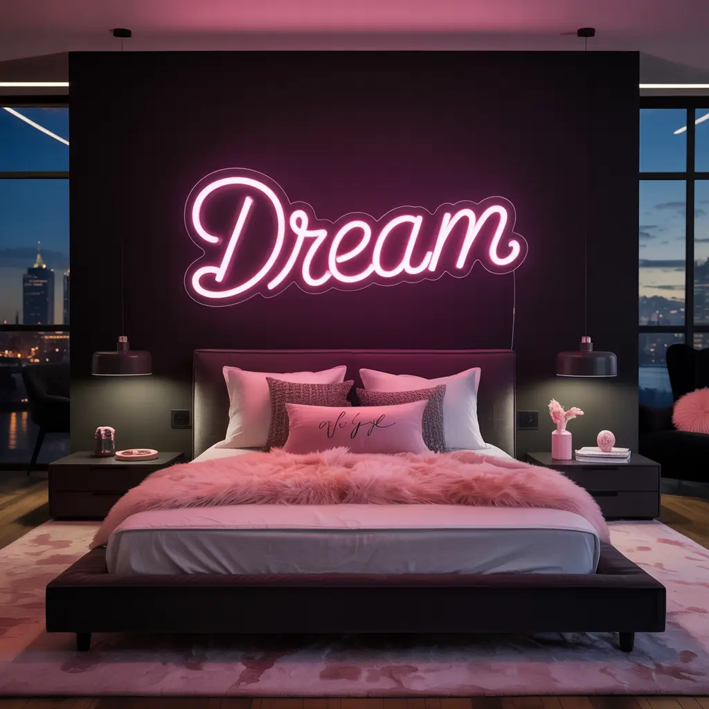 Let’s end with something fun – neon signs in pink against black walls! This trend brings personality and literal glow to your bedroom. Whether it’s a motivational quote, your name, or just a cool shape, pink neon against black creates instant ambiance.