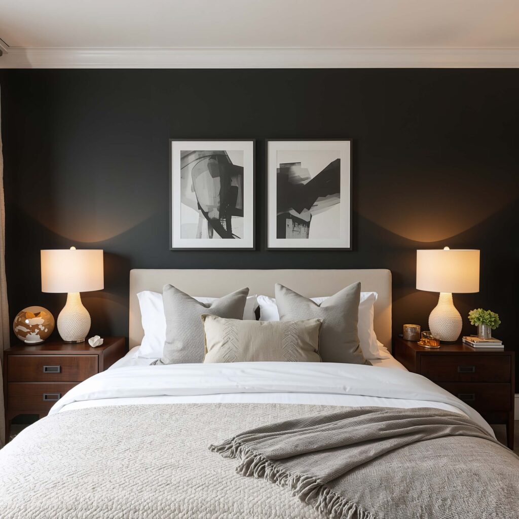 Choosing the right wall makes all the difference. Pick the wall behind your bed – it creates a natural focal point and makes your bed look like it belongs in a boutique hotel. Dark walls actually make rooms feel cozier, not smaller (shocking, right?).