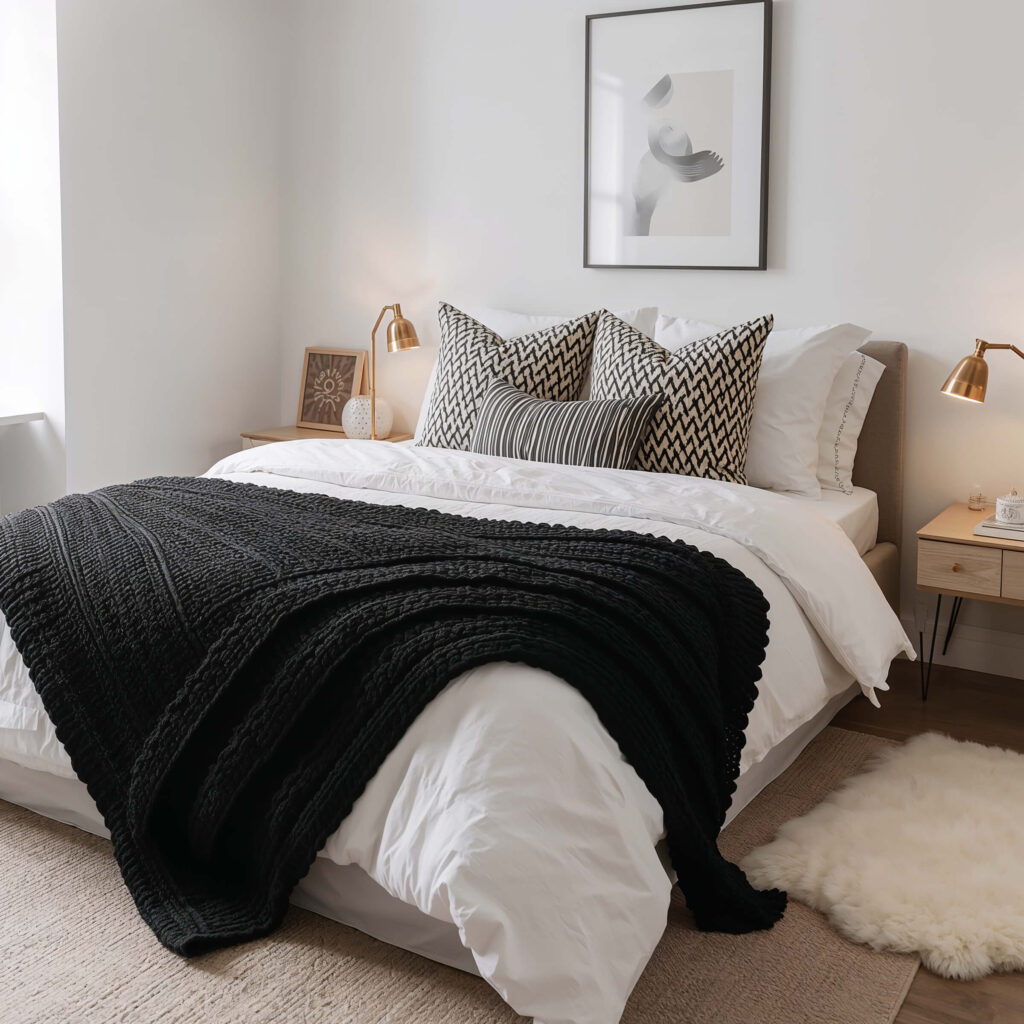 This might be the easiest upgrade on the list, and IMO, it delivers maximum impact for minimal effort. Start with hotel-quality white bedding (yes, splurge here – you spend a third of your life in bed). Then layer on black throws and pillows for that perfect contrast.