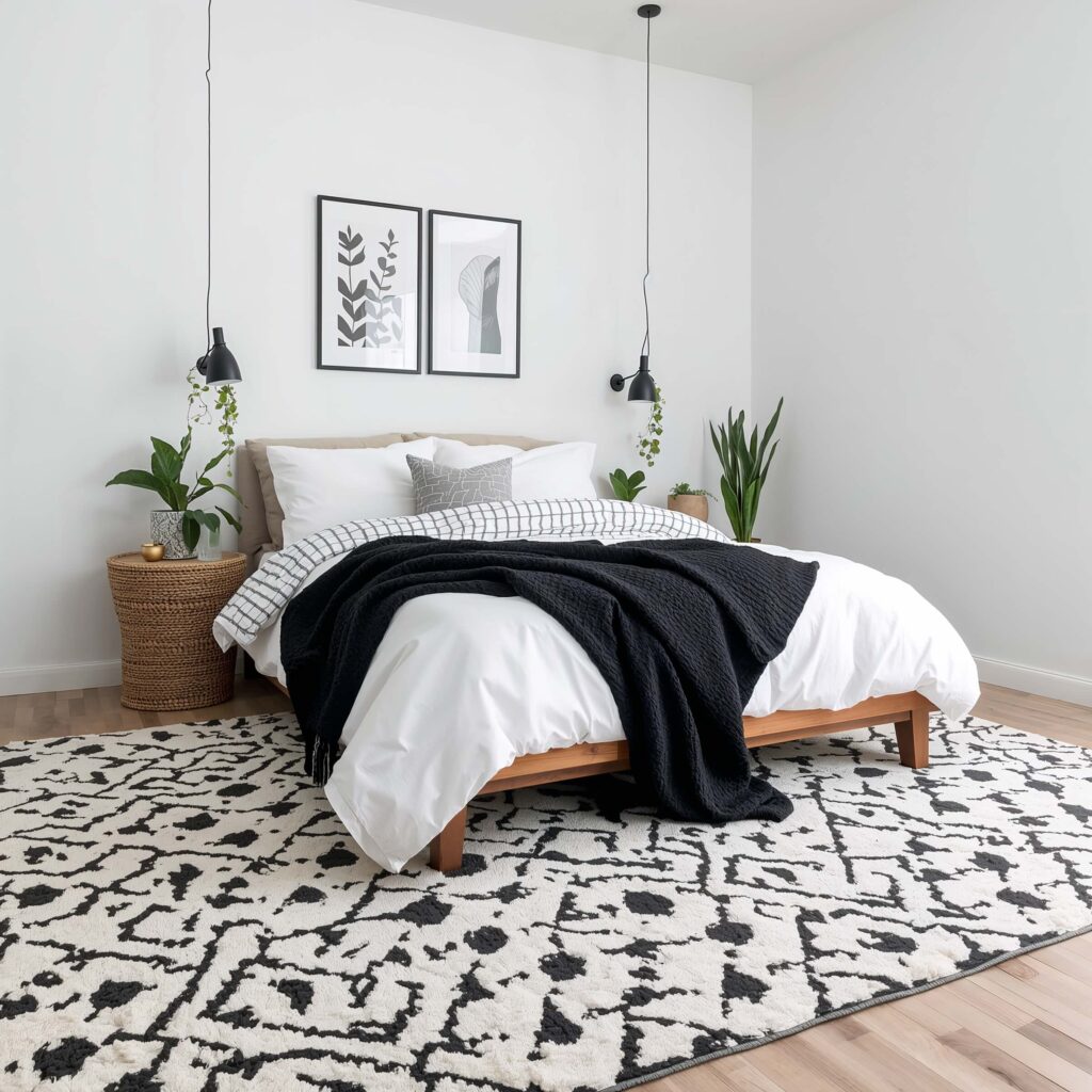 Rugs anchor a room like nothing else, and geometric patterns in black and white? Chef’s kiss. They add movement and energy while maintaining that monochrome sophistication we’re chasing.