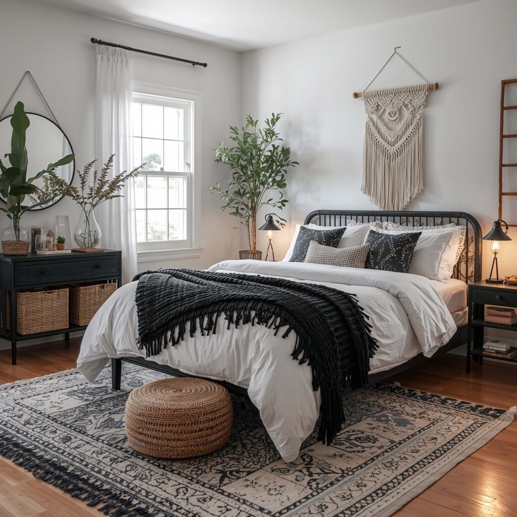 Macramé wall hangings in black or natural cotton create instant boho credentials. Add woven baskets, pampas grass in black vases, and layers upon layers of textiles. The key? Mixing patterns fearlessly within your color constraints.