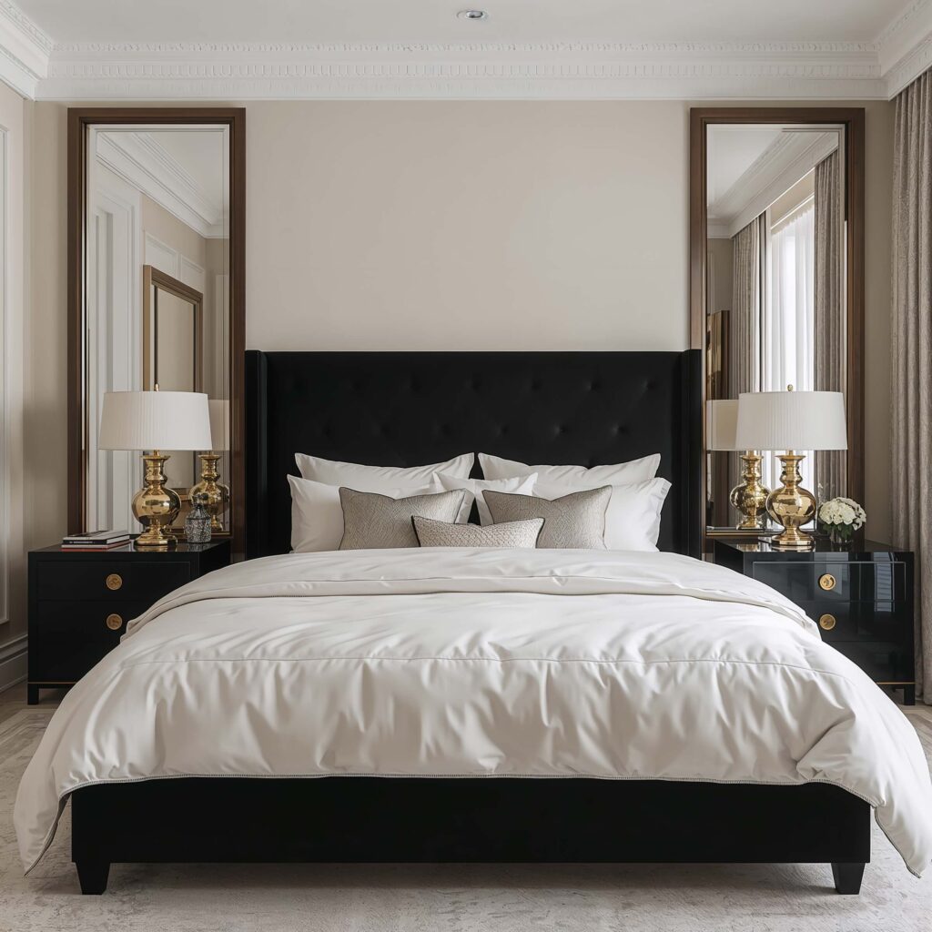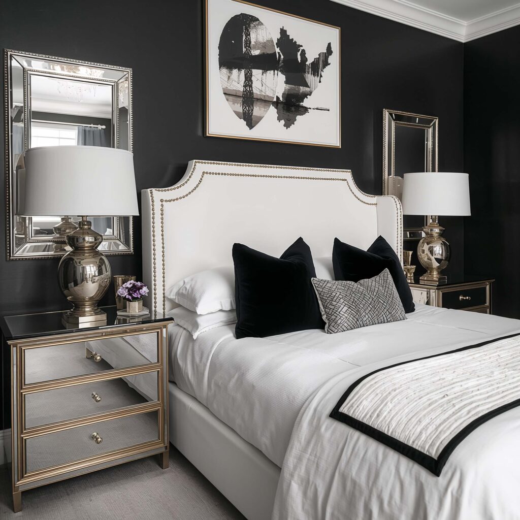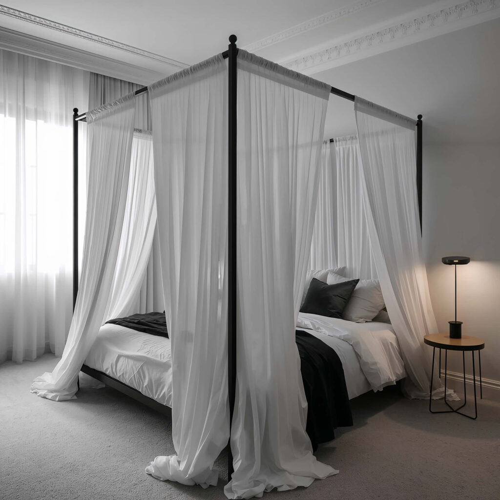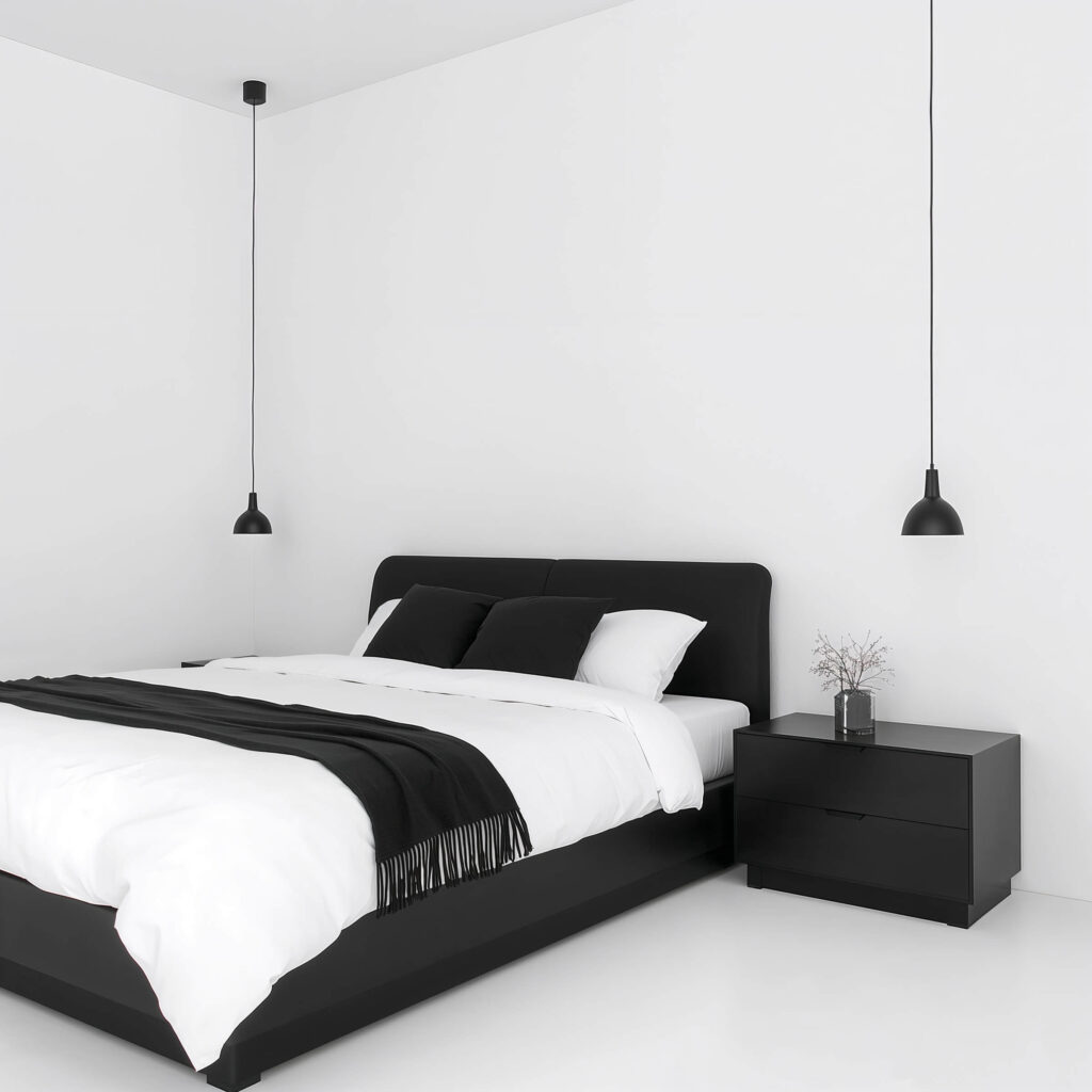 Choose furniture with interesting silhouettes to prevent the look from feeling flat. My black metal four-poster bed against white walls creates architectural interest without overwhelming the space. Add a black dresser and nightstands, and you’ve got instant sophistication.