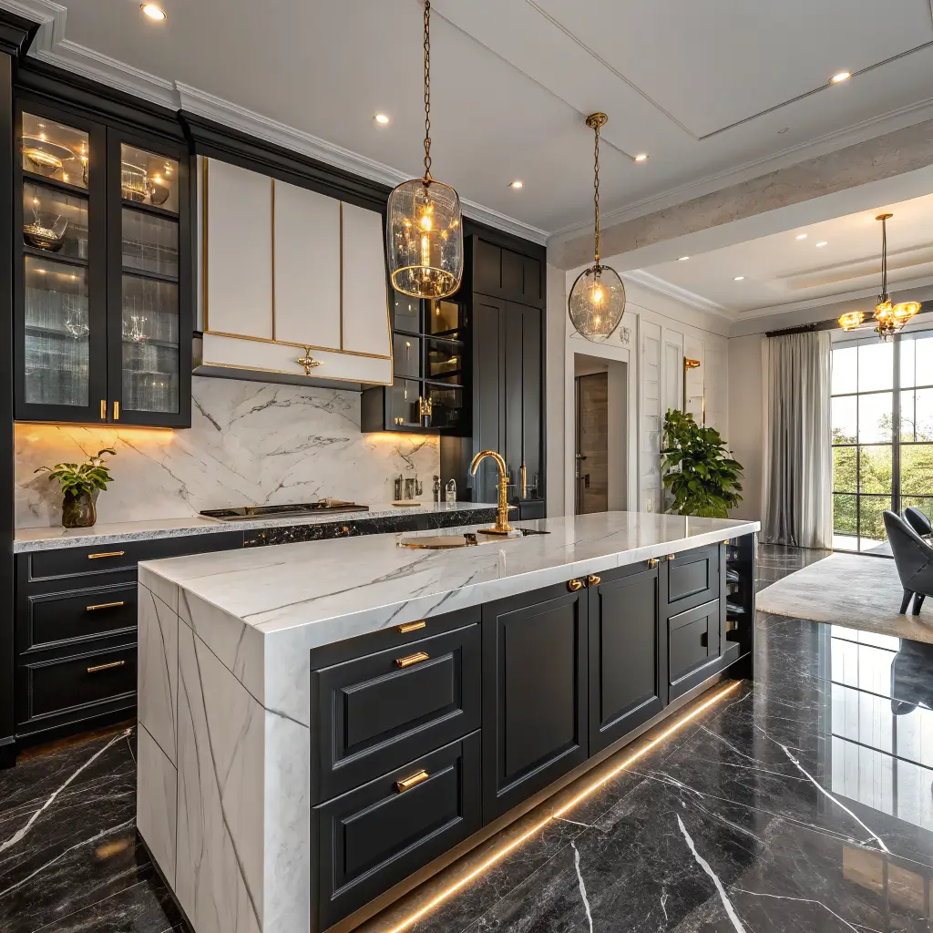 Mixing black marble tiles with white quartz creates luxury layering that screams expensive taste (even if you got everything on sale). The natural veining in marble adds organic movement while quartz provides pristine contrast. This combination feels both natural and refined.