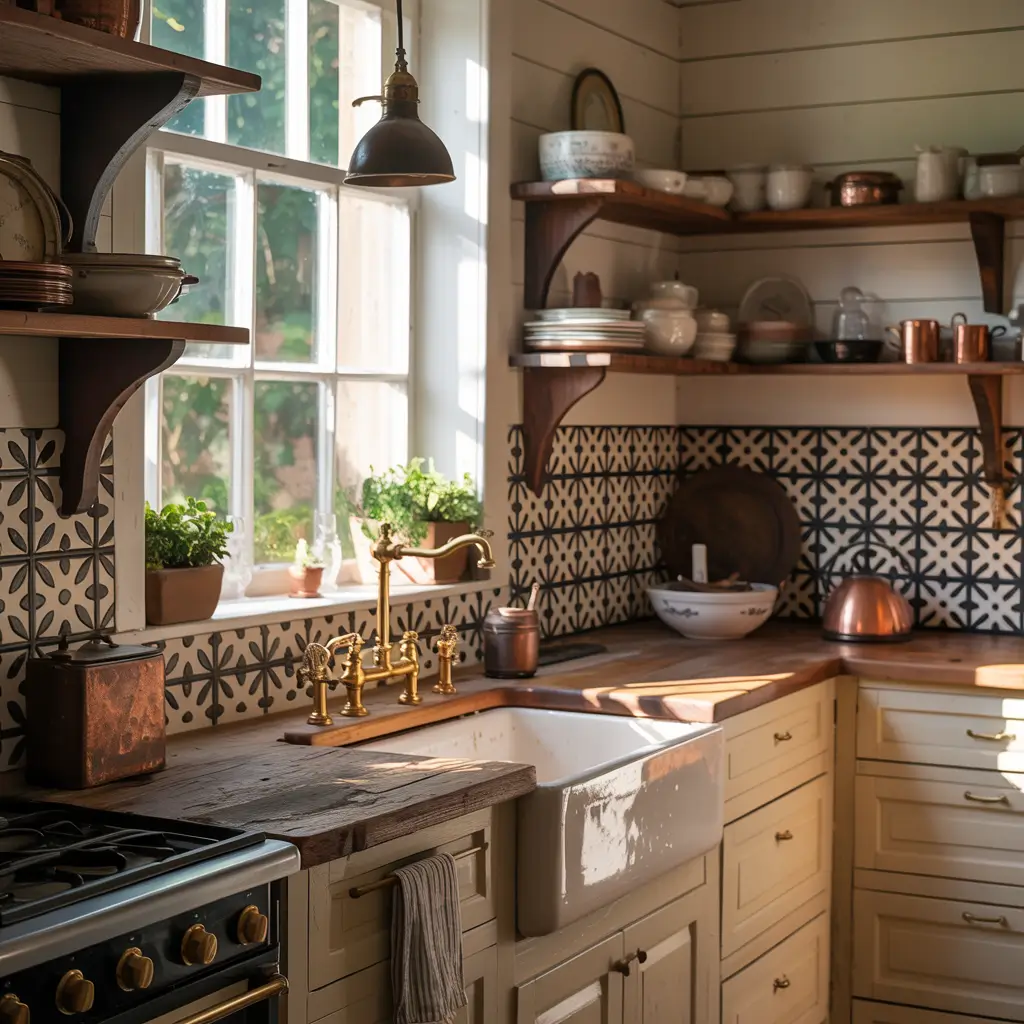 Think white shaker cabinets with black and white patterned floor tiles, or a classic white farmhouse sink against a bold black tile backsplash. The contrast prevents farmhouse style from feeling too sweet or predictable. Add black hardware and fixtures to tie the look together.