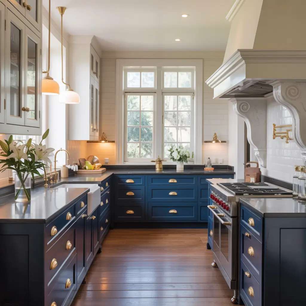 This color scheme works particularly well in kitchens with lots of natural light. The sunlight brings out the subtle blue undertones in the navy, creating this dynamic interplay throughout the day. Morning light makes it feel fresh and energizing, while evening light creates a cozy, intimate atmosphere.