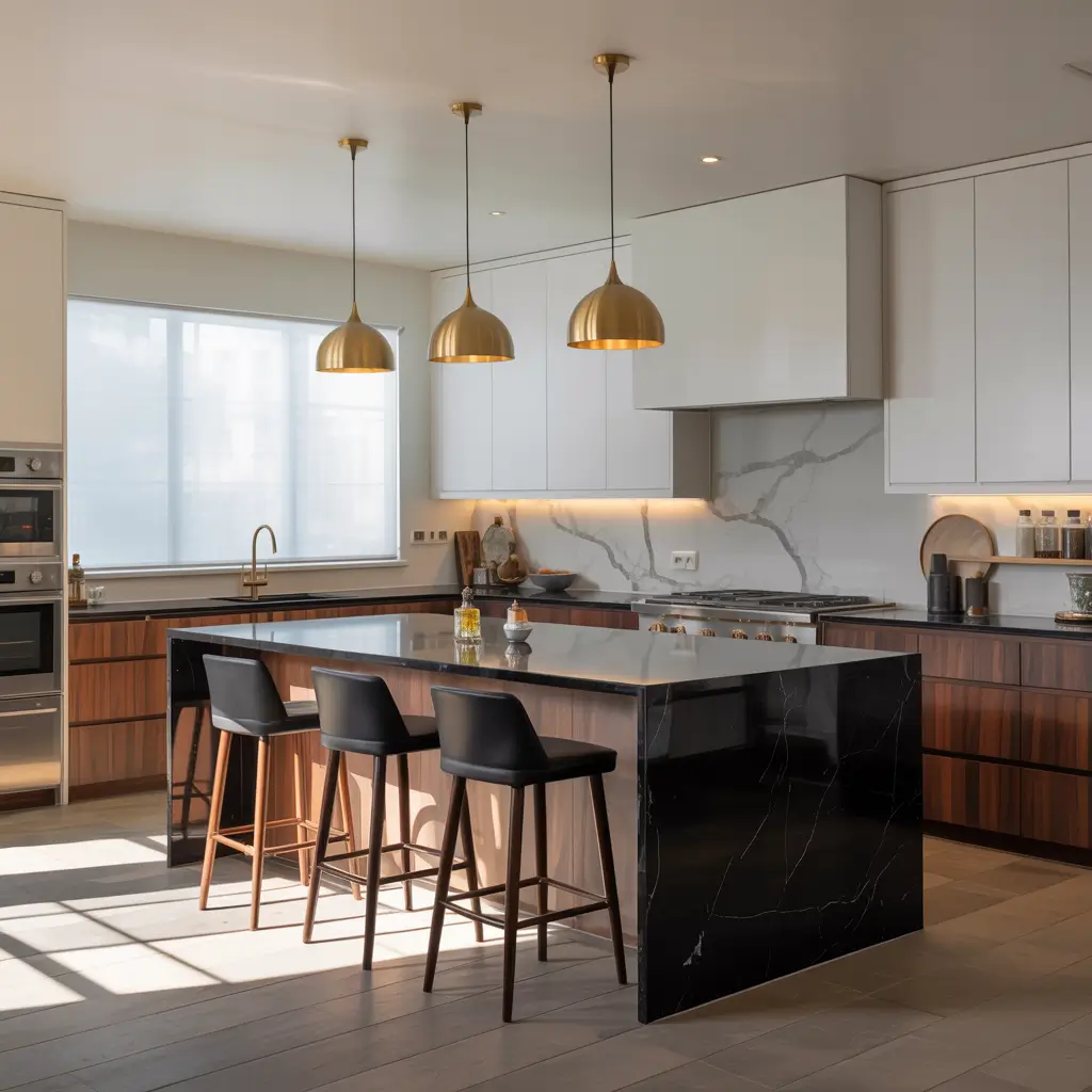 Let’s talk about making a statement. Combining black countertops with marble elements creates a level of luxury that makes you feel like you should be wearing heels just to make breakfast. Whether you go for a marble backsplash, island top, or flooring, this combination never fails to impress.