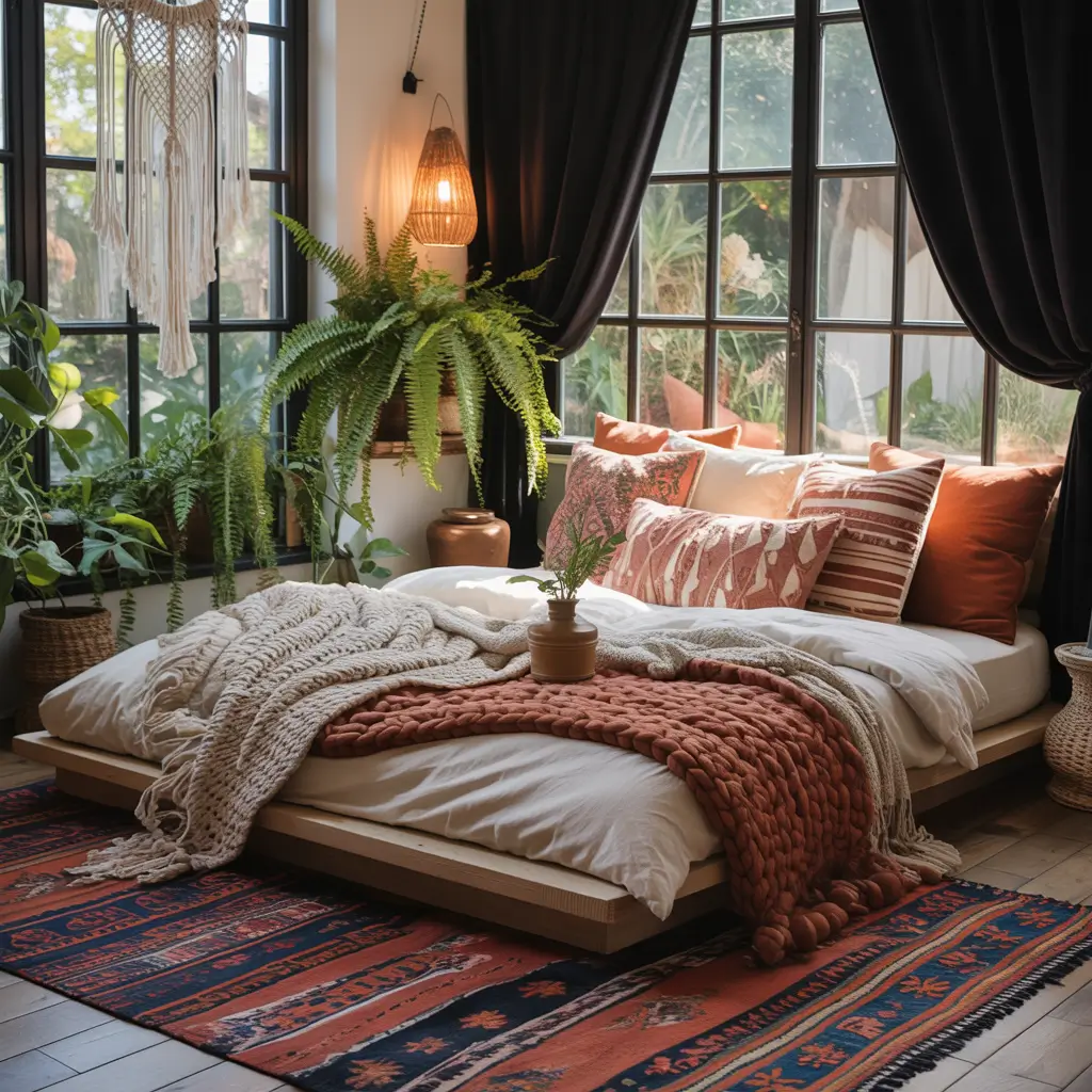 Black actually makes other boho elements pop more. Those terracotta pots? They glow against black curtains. The cream macramé? It looks even more intricate. It’s like the black creates a backdrop that lets everything else shine.