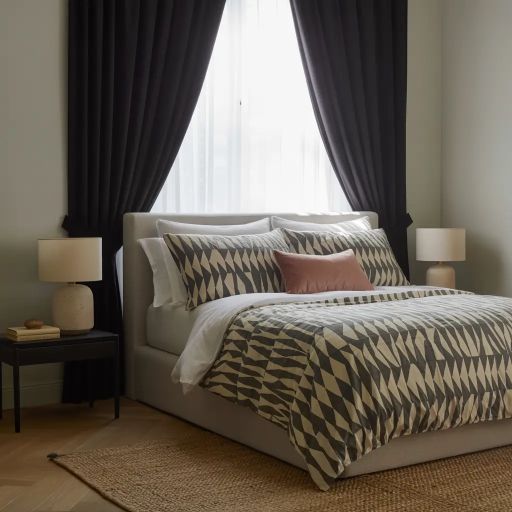 The solid black acts like a frame, making your bedding the star of the show. My geometric print bedding pops against the black curtains without competing for attention. It’s like having a neutral wall that happens to block light and add drama.