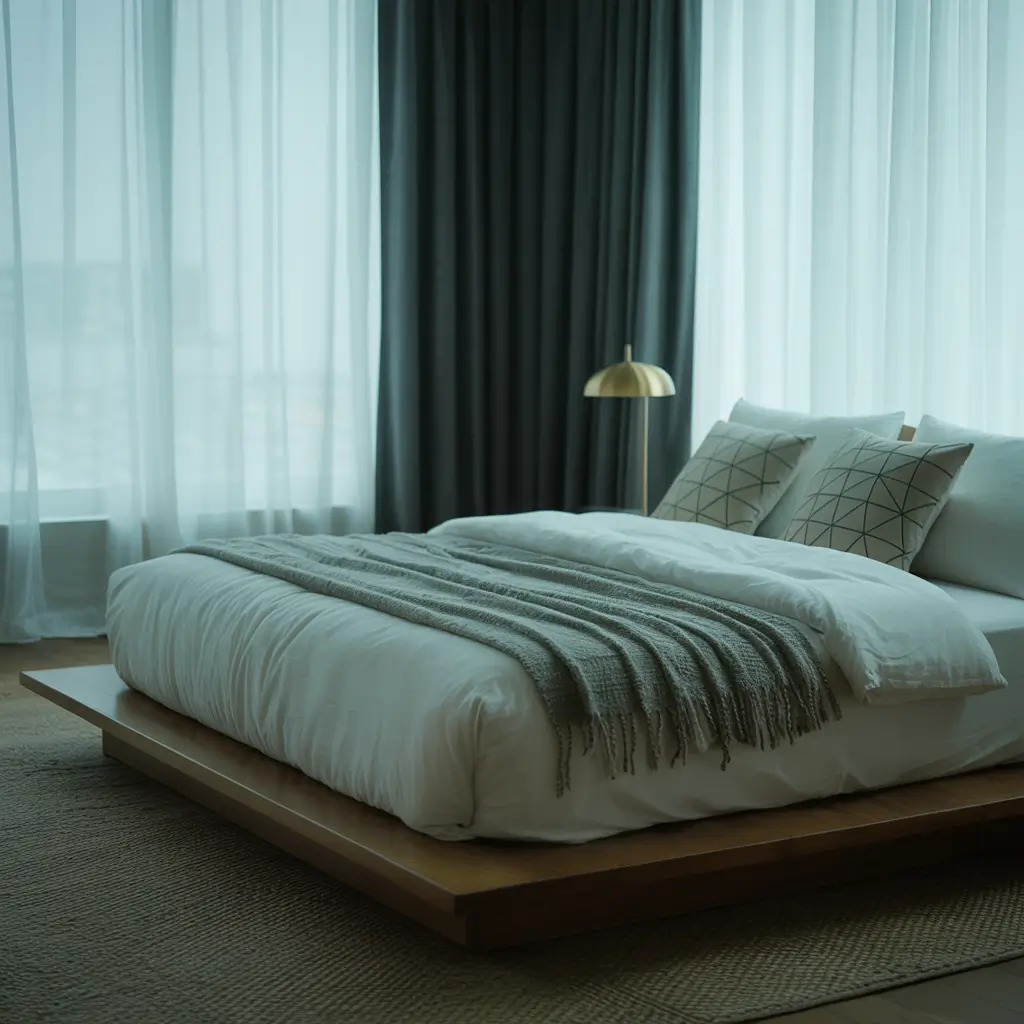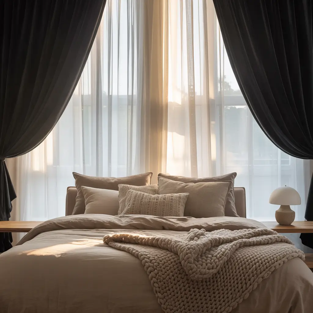 I hang white sheers closest to the window with black curtains on a separate rod behind them. During the day, the black curtains frame the window while sheers filter light beautifully. At night, close the black curtains for complete darkness. It’s like having two different bedrooms in one.