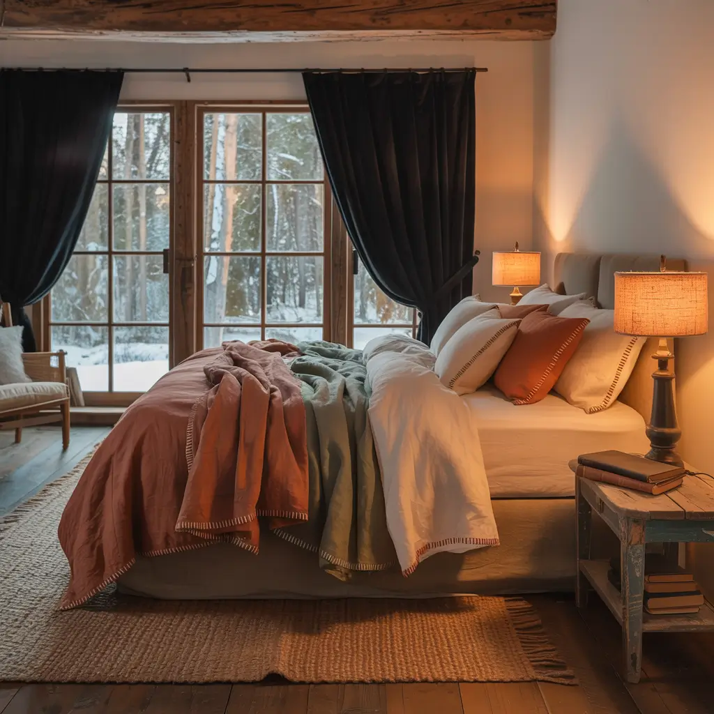 Black curtains in a rustic bedroom might seem unexpected, but they create amazing contrast with natural wood and organic textures. I discovered this combination at a mountain cabin and immediately recreated it at home.