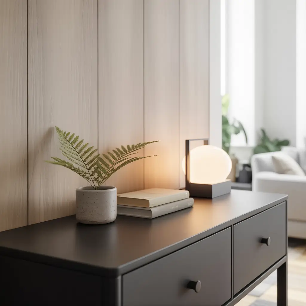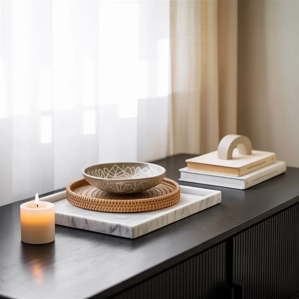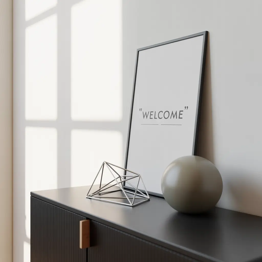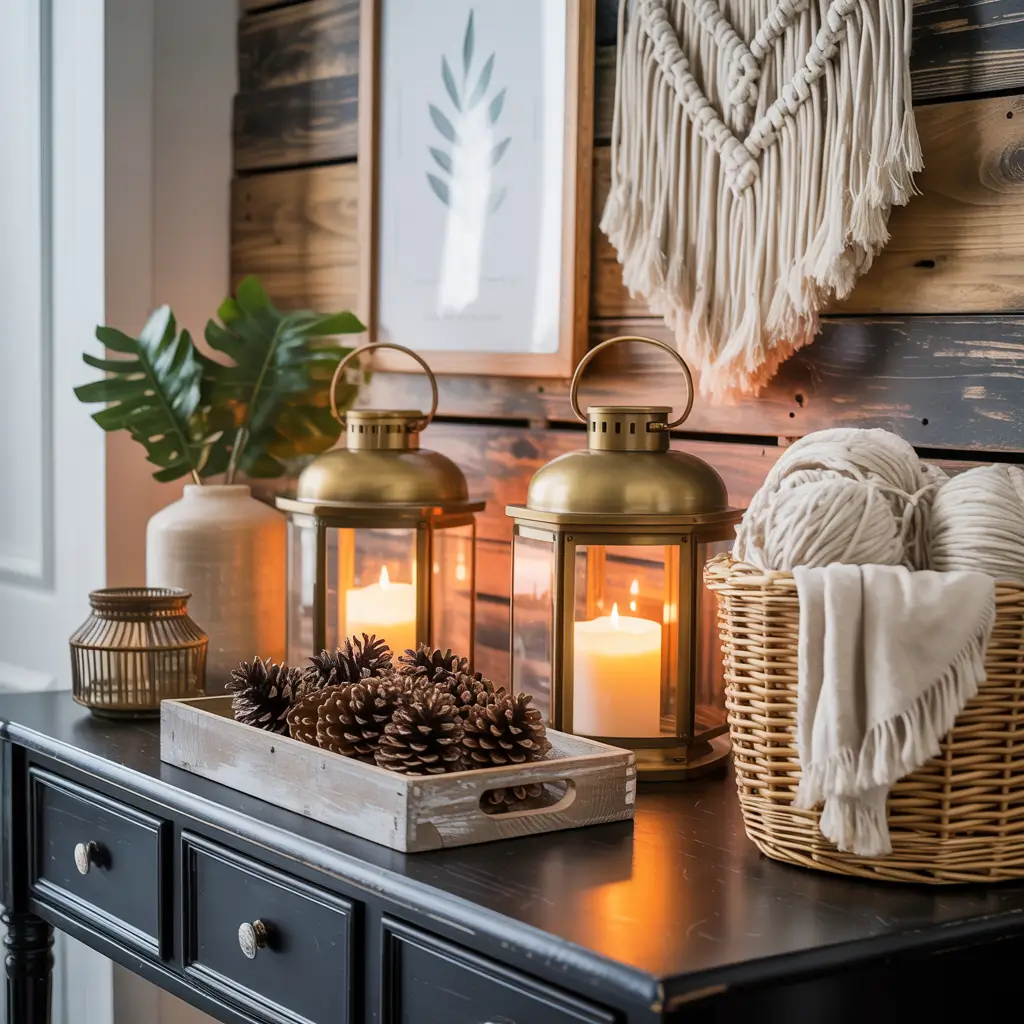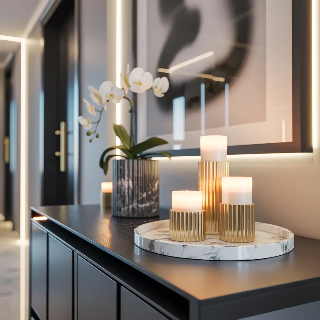 Start with the basics: clean lines, natural materials, and a neutral palette. Add a simple white ceramic vase with a single eucalyptus branch. Place a wooden bowl for keys. Include a small potted succulent in a concrete planter.