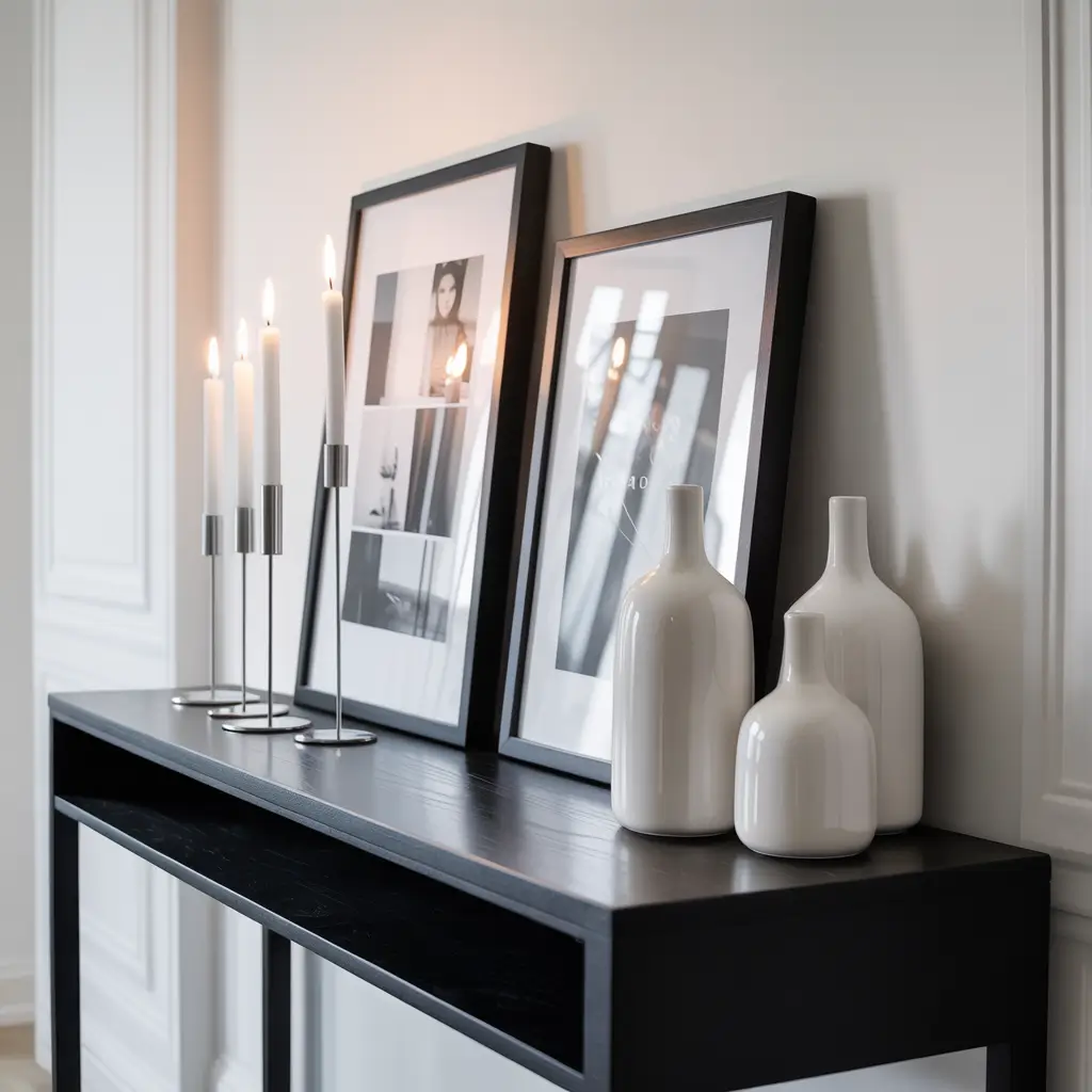 I learned this lesson the hard way after spending hours trying to coordinate colors for my entryway. Finally, I stripped everything back to black and white, and suddenly the space felt intentional rather than chaotic. Start with a white ceramic vase against your black table. Add black and white photography in matching frames. Throw in a white marble tray for keys and mail.