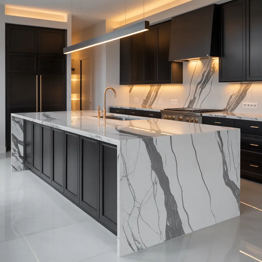 White marble literally glows against black cabinets, creating natural brightness without artificial lighting. The veining adds movement and interest, preventing the high contrast from feeling stark or cold.