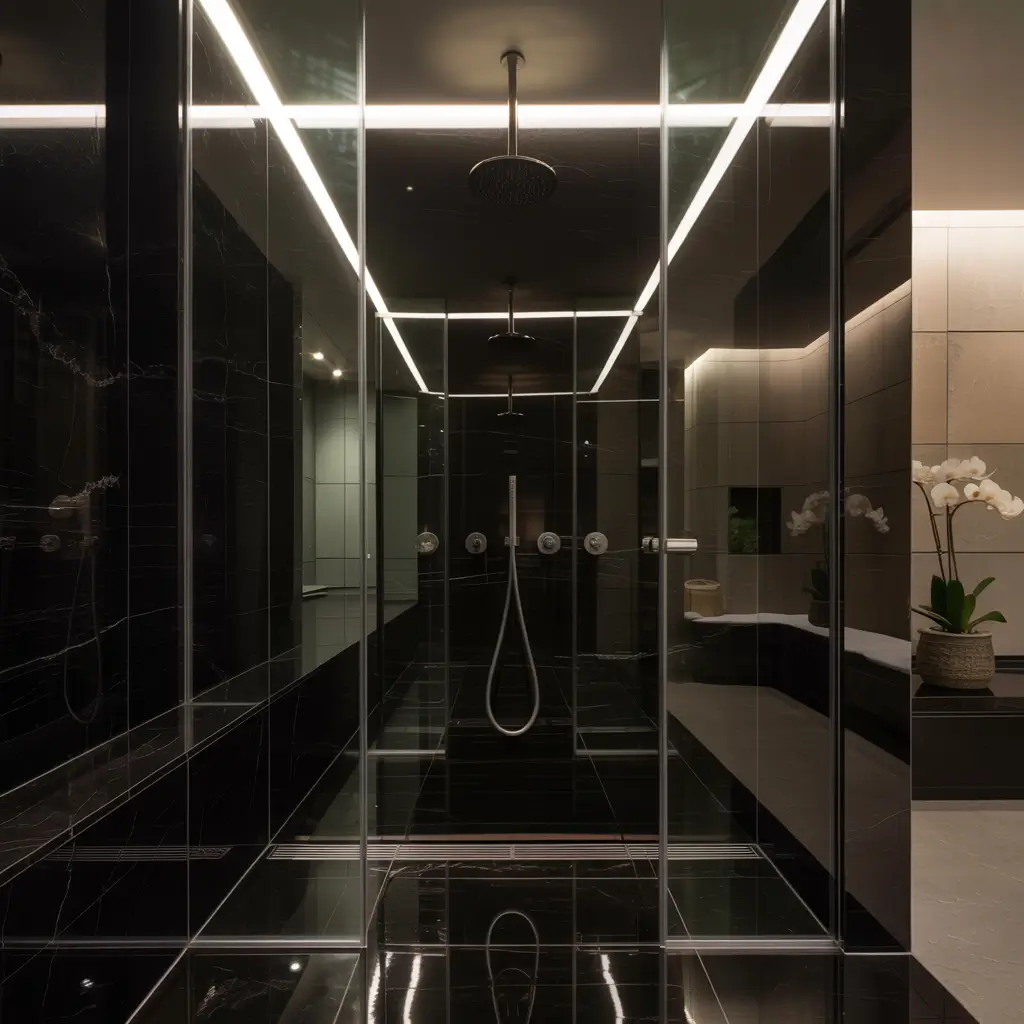 Black Marble Shower with Glass Enclosure