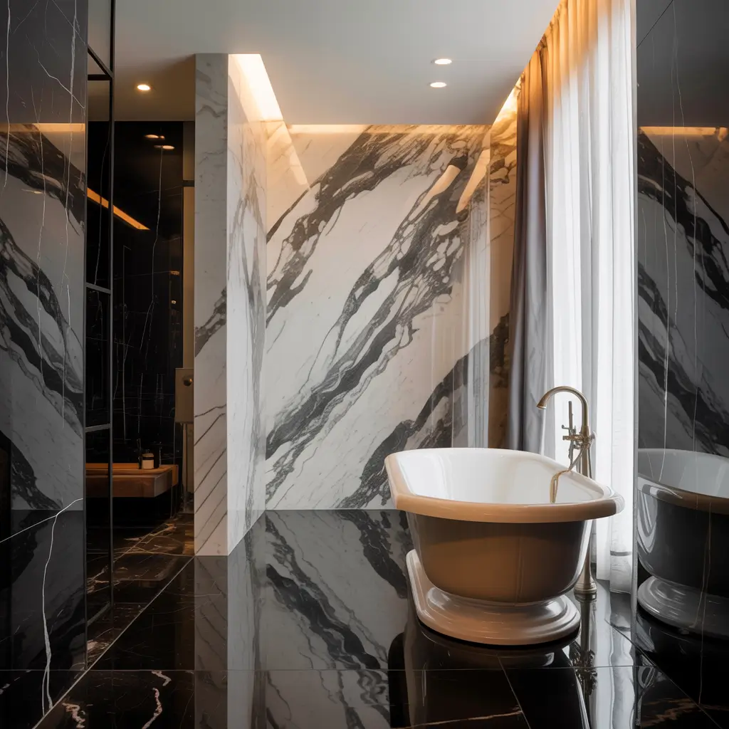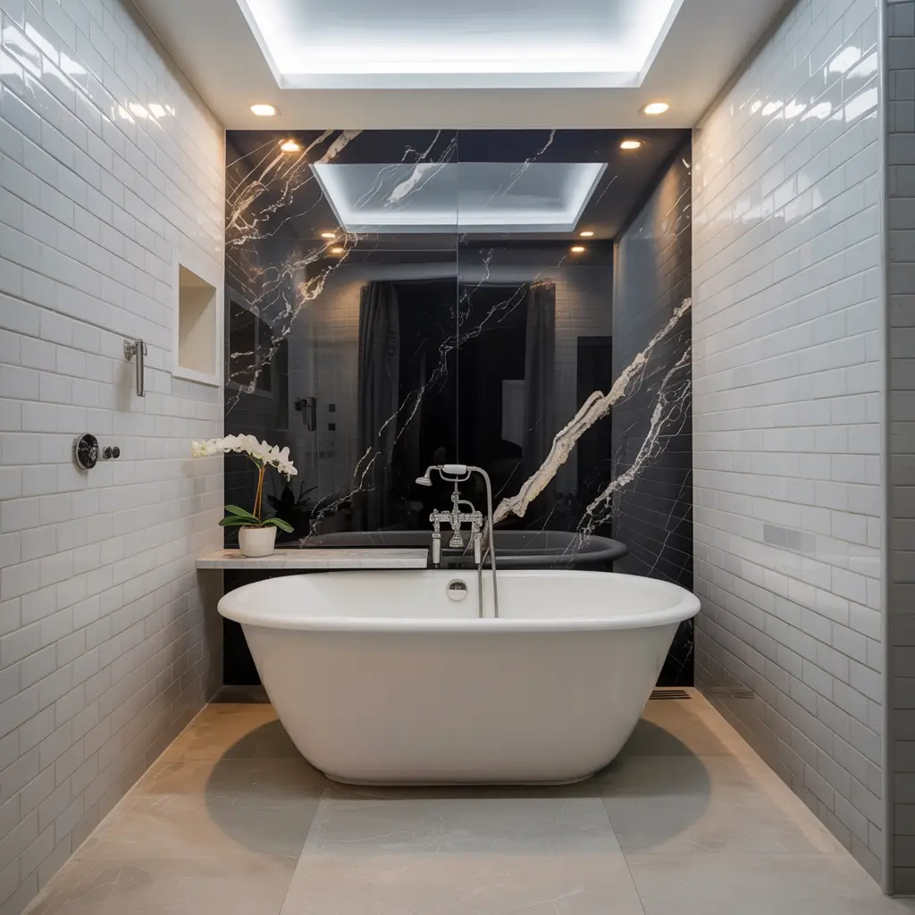 Consider continuing the white tiles onto the ceiling. It draws the eye up and makes the black marble accent wall feel intentional rather than random. Plus, white ceiling tiles reflect light beautifully.