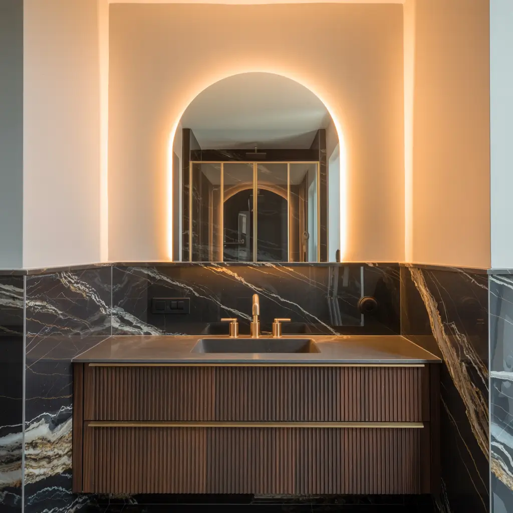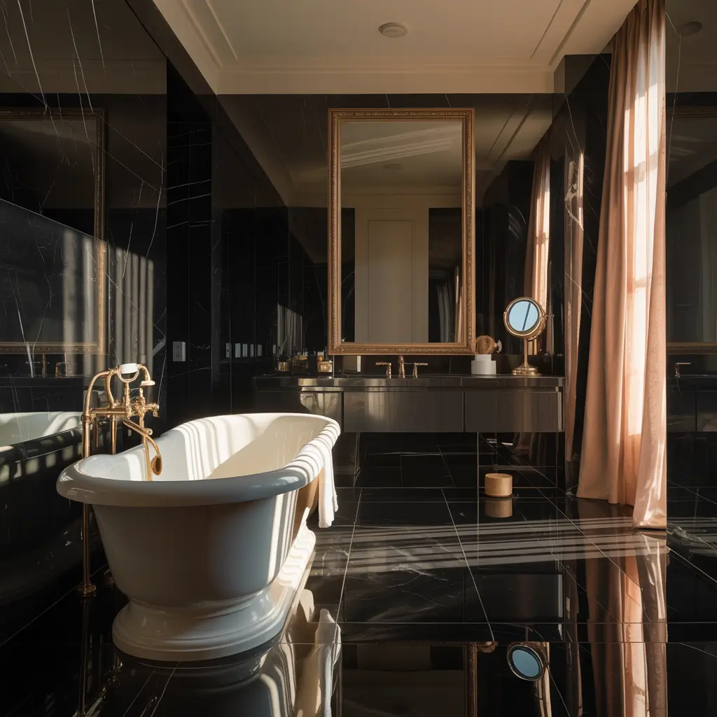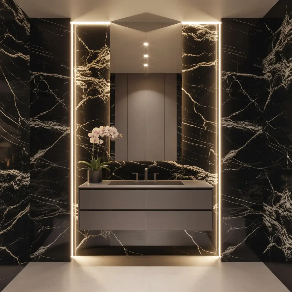 Mirror placement becomes crucial in small spaces. A large mirror opposite your black marble feature doubles the visual impact while bouncing light around. It’s the oldest trick in the book because it actually works.