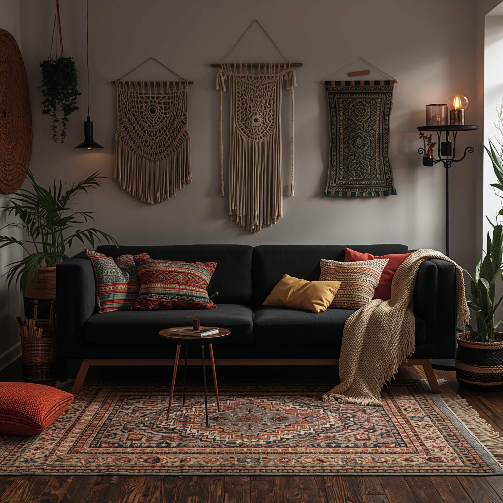 Picture this: your black sofa loaded with mustard yellow pillows, burnt orange throws, and maybe a chunky cream knit blanket draped casually over one arm. Add a jute rug underneath, some macrame wall hangings, and boom – instant cozy vibes.