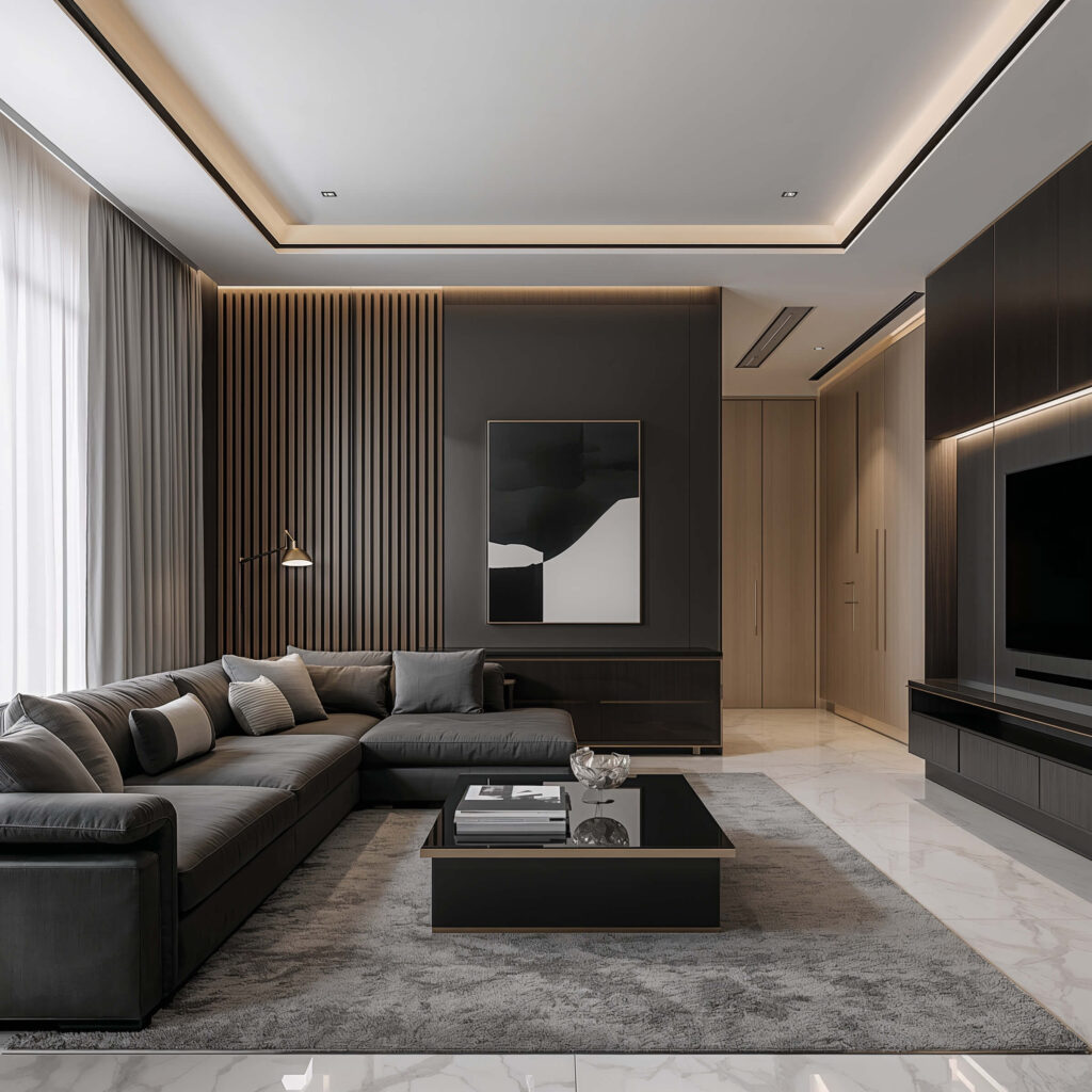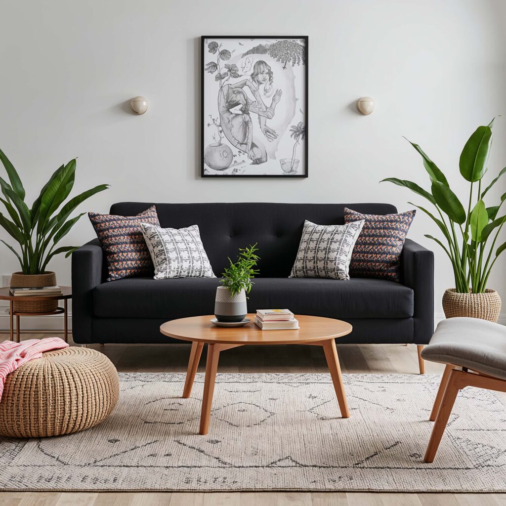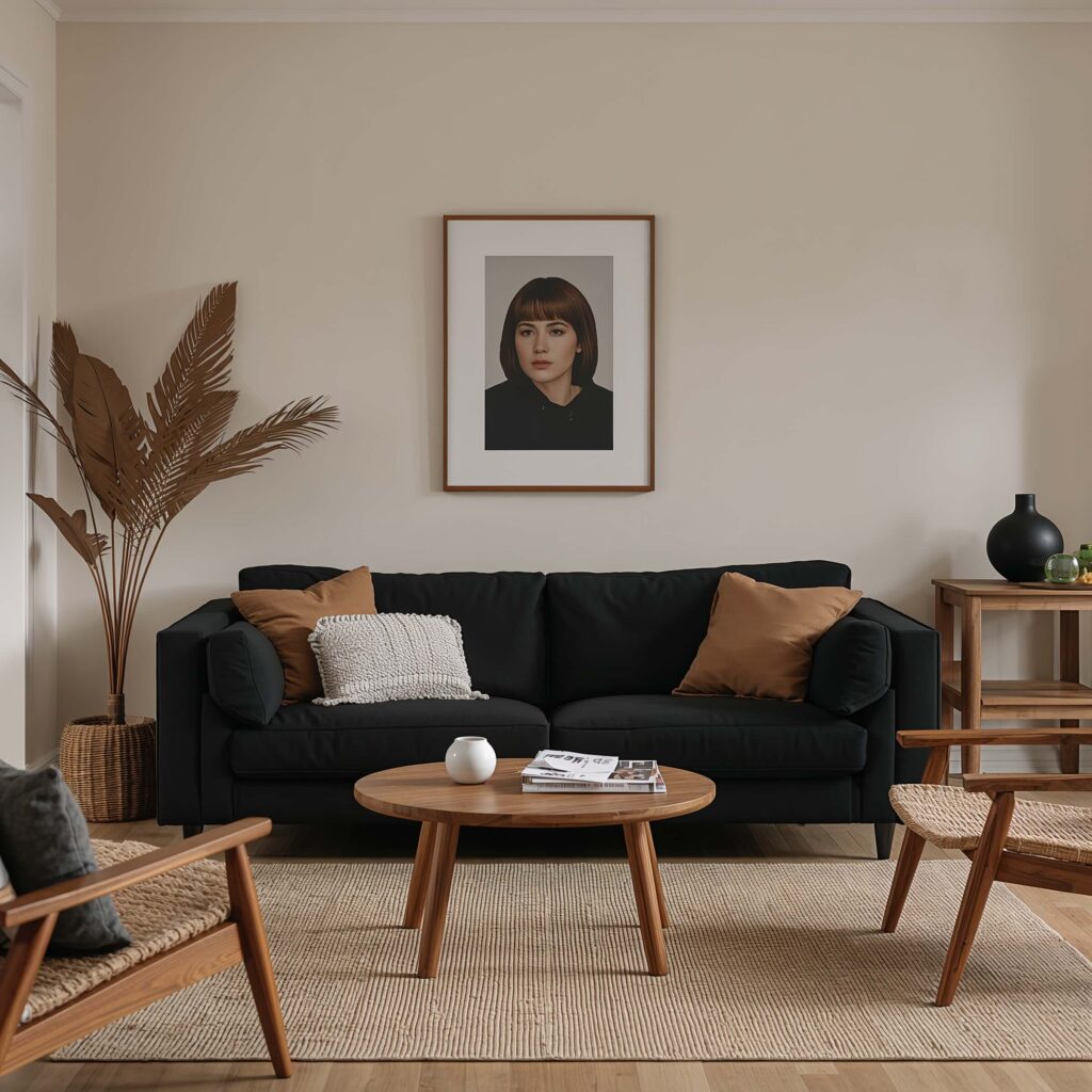 Ever notice how black and wood just work? It’s like peanut butter and jelly, but for your living room. The warmth of natural wood perfectly balances the coolness of a black sofa, creating a space that feels both modern and inviting.
