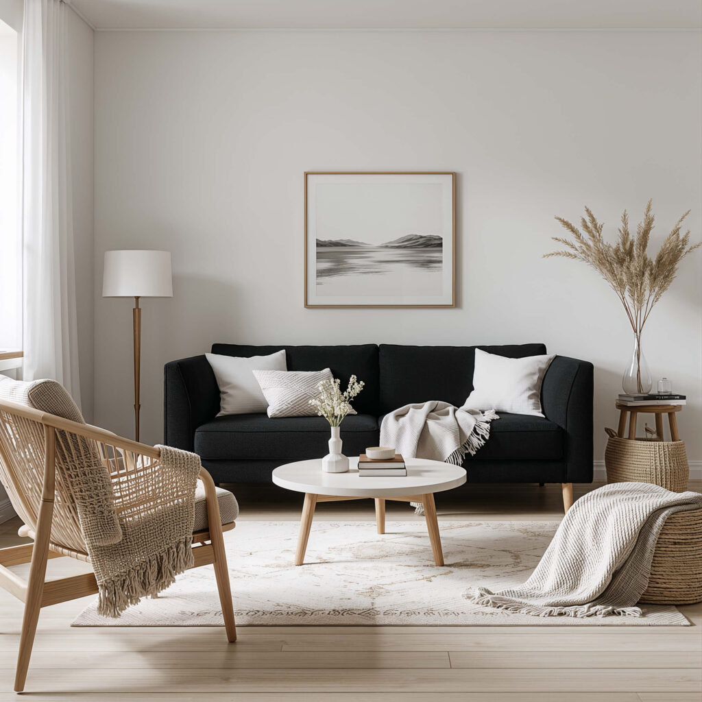 Picture white walls, natural wood floors, and your black sofa dressed in chunky knit blankets and sheepskin throws. Add some simple black and white photography, maybe a fiddle leaf fig in the corner, and you’ve nailed that effortless Scandi look.