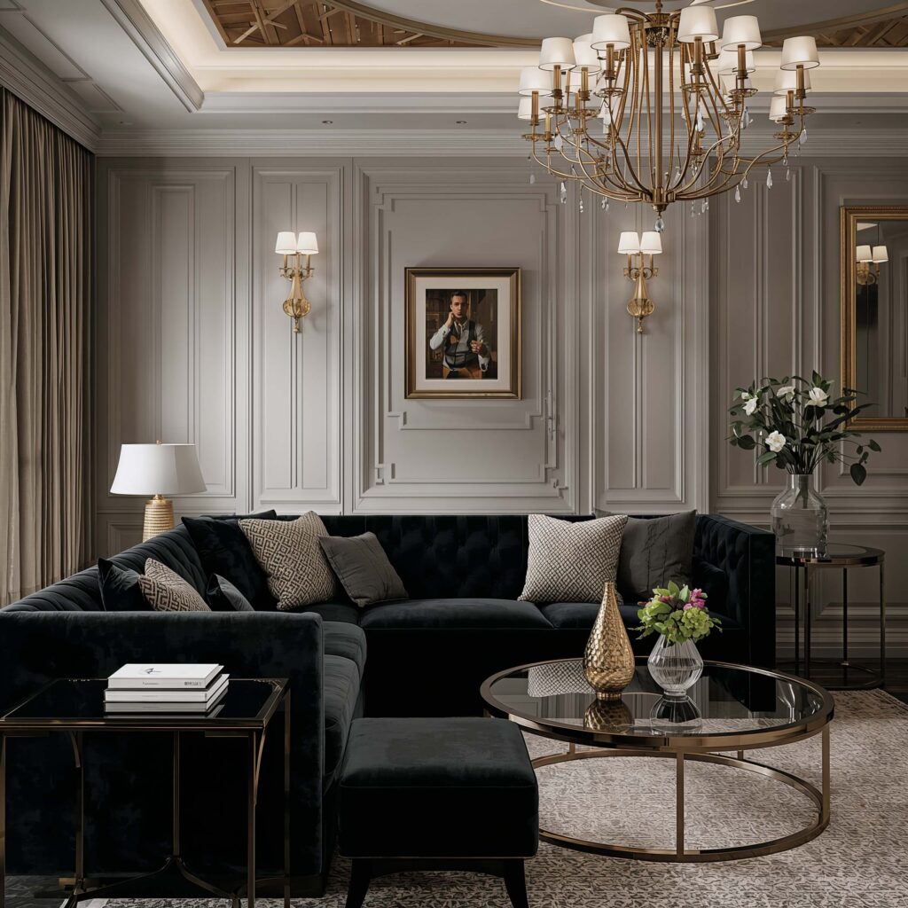 Try a gold-framed mirror above the sofa, silver side tables, and maybe some copper accents in your decor pieces. The contrast between the matte black fabric and reflective surfaces creates this dynamic visual interest that never gets old.