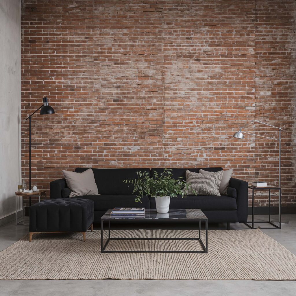 Think exposed brick walls, metal shelving units, Edison bulb lighting, and concrete elements. Your black sofa anchors the space while all those hard materials create an urban loft vibe that’s both edgy and inviting.