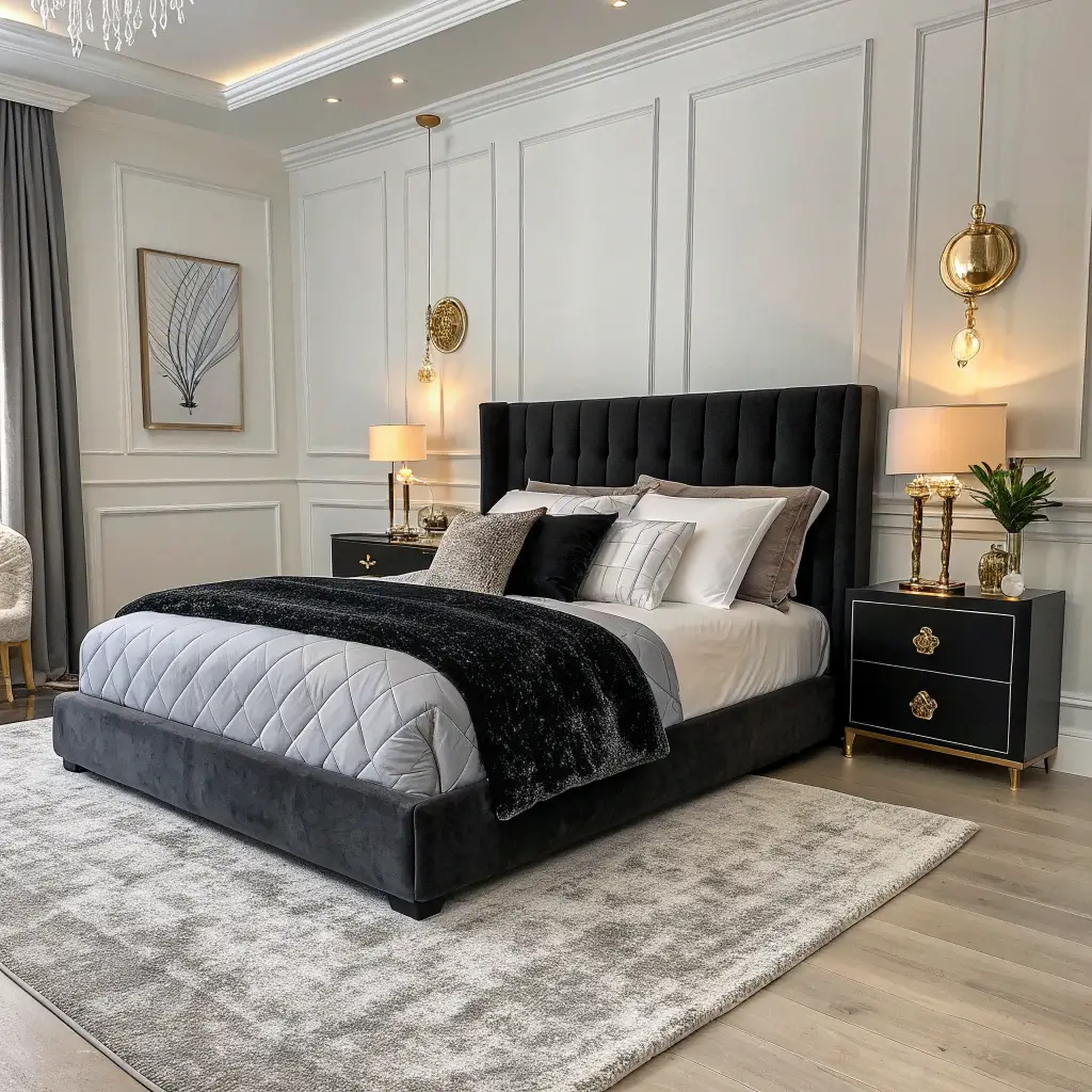 Think of this as the bedroom equivalent of a perfectly tailored black suit with a crisp white shirt. Everything feels intentional and sharp.