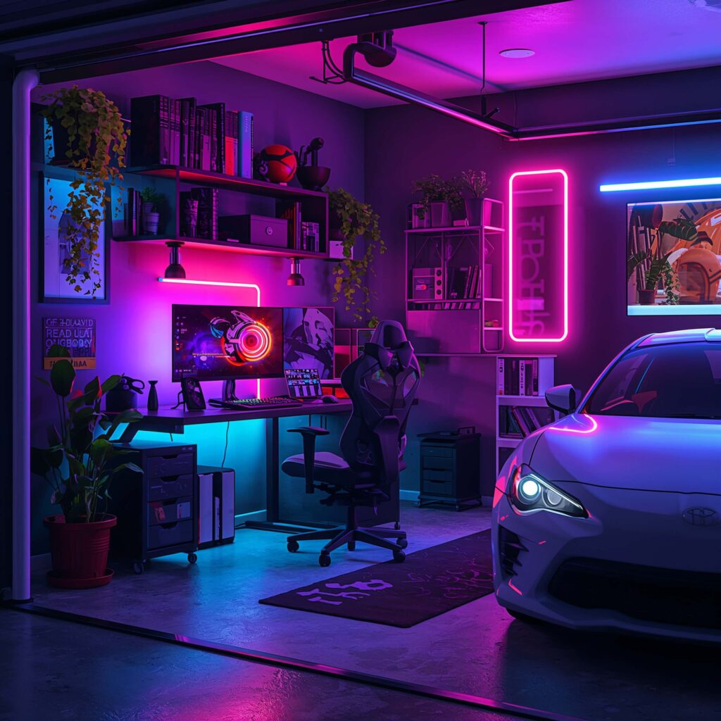 What I love about this build is that there are no rules. You can go full cyberpunk with neon lighting and dark walls, or keep it casual with a couch, a TV, and a relaxed hangout atmosphere. The garage-to-gaming-room conversion is a trend in real life, too, so it feels relevant and modern.