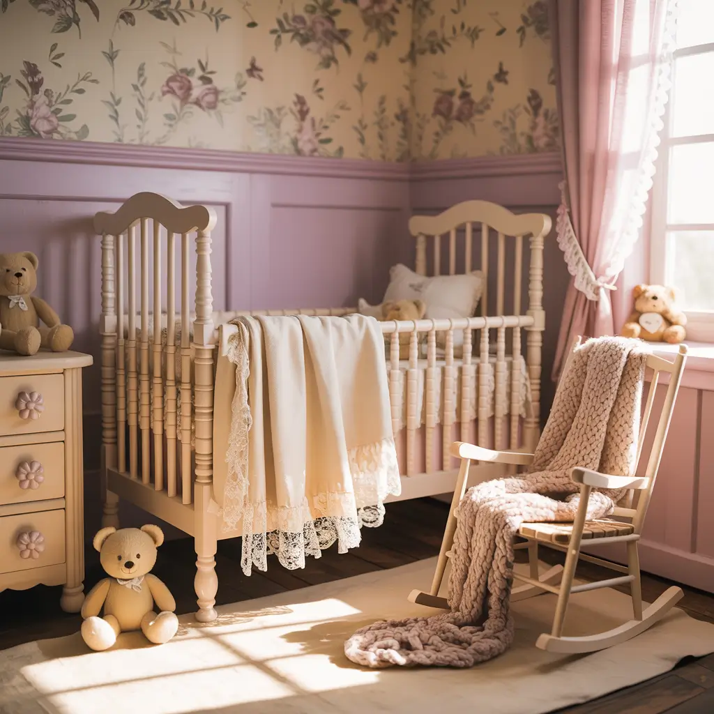 Vintage cottage nurseries bring that cozy, timeless aesthetic that never goes out of style. This theme works beautifully in traditional or farmhouse style Bloxburg homes and creates the warmest, most inviting spaces.