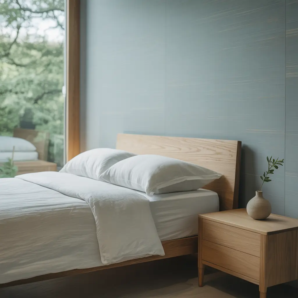 My current bedroom follows Scandinavian principles with a blue-grey accent wall that I’m completely obsessed with. Some days it looks blue, others grey, and occasionally almost lavender. Combined with white walls, light wood, and minimal decor, it creates the perfect hygge atmosphere.