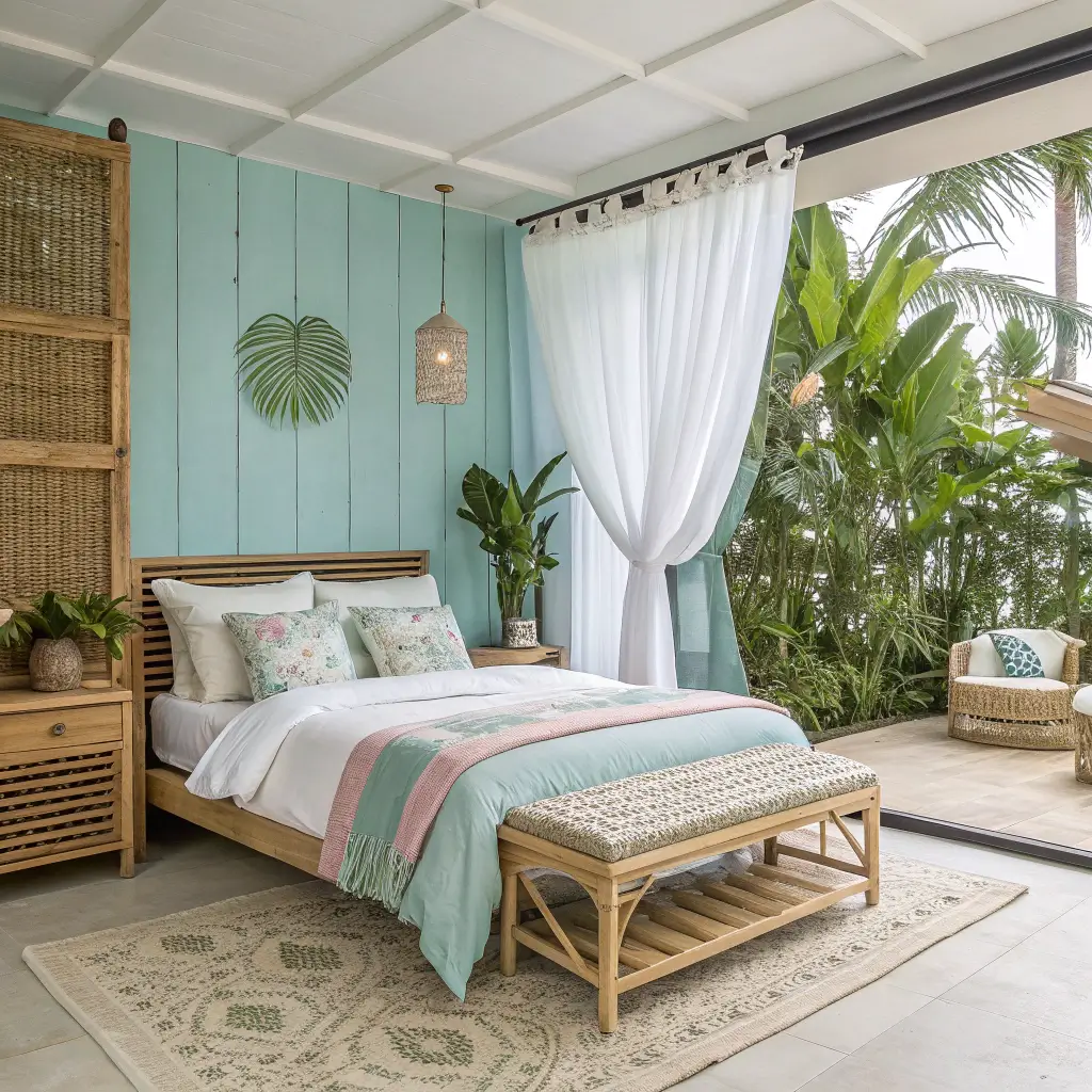 Aqua accent walls bring tropical vibes without the humidity. This cheerful blue-green shade creates instant vacation mode in any bedroom.