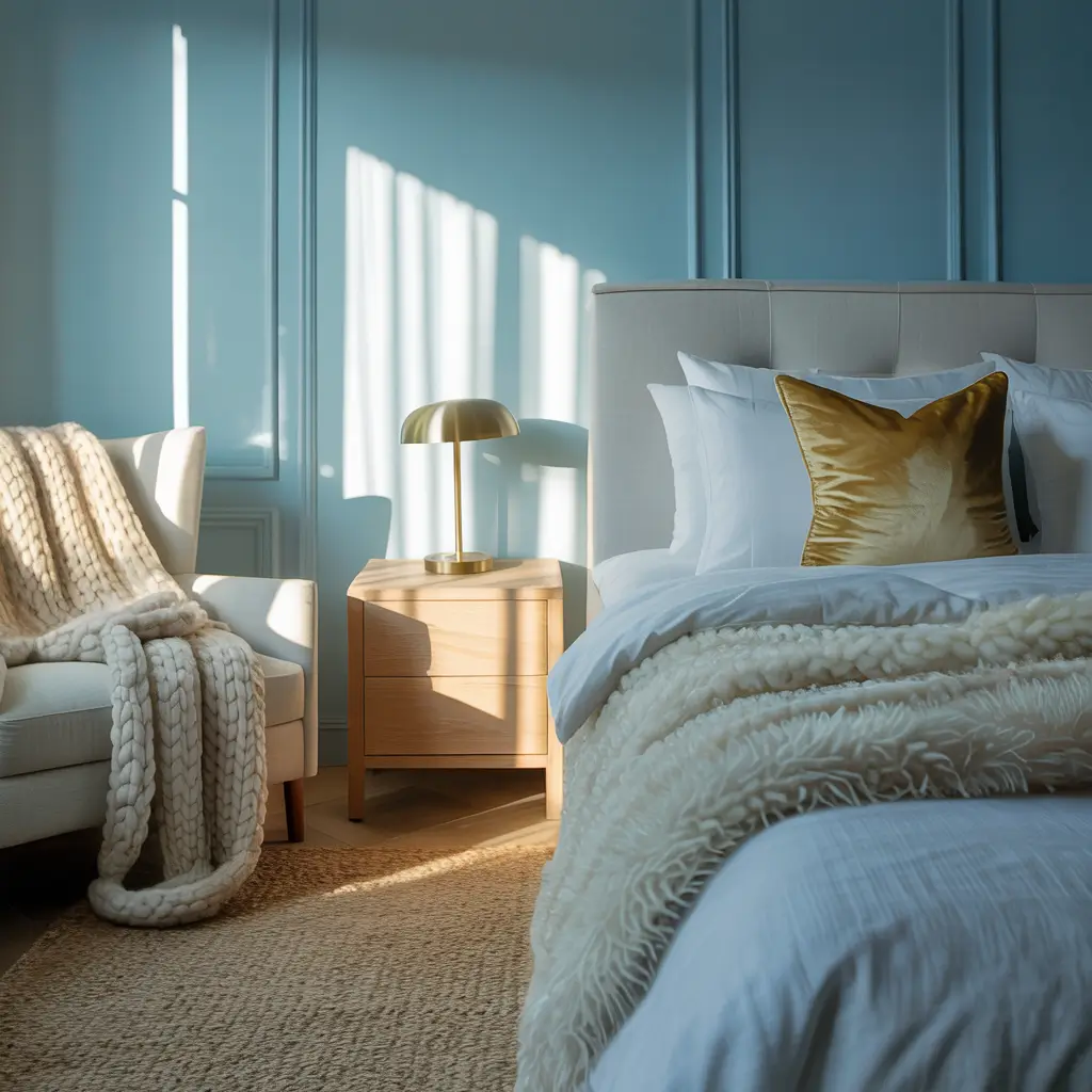 Cozy Sky Blue and Gold Accent Bedroom