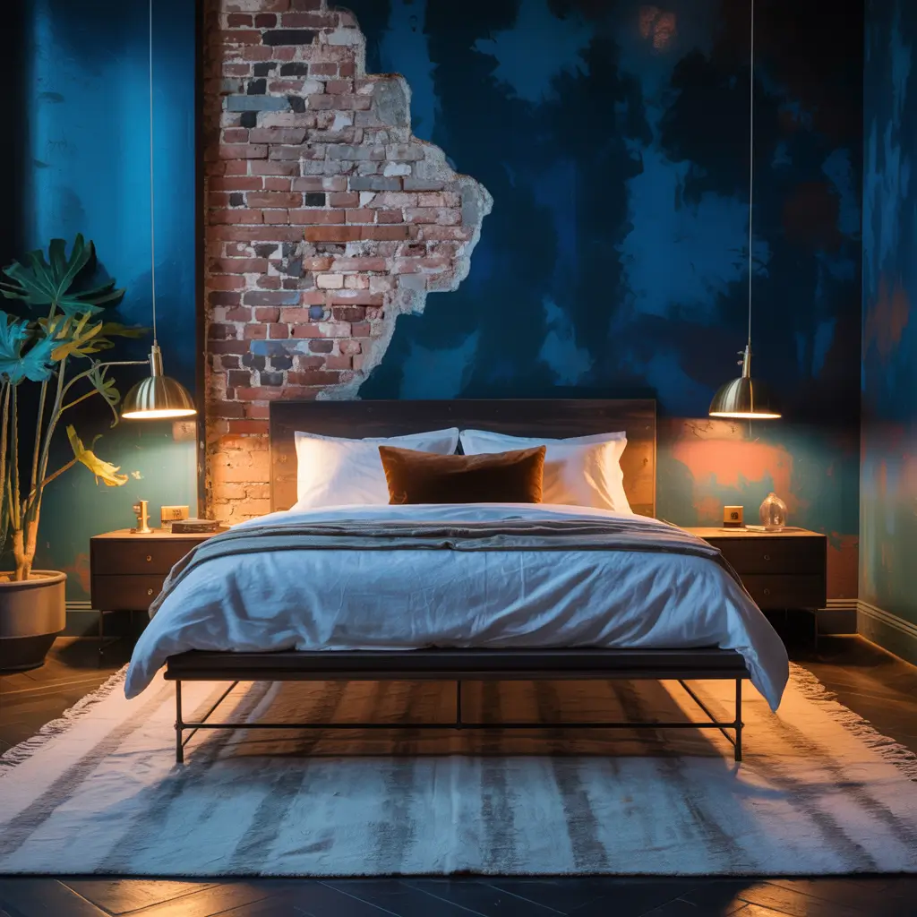 Deep Blue and Brass Industrial Bedroom