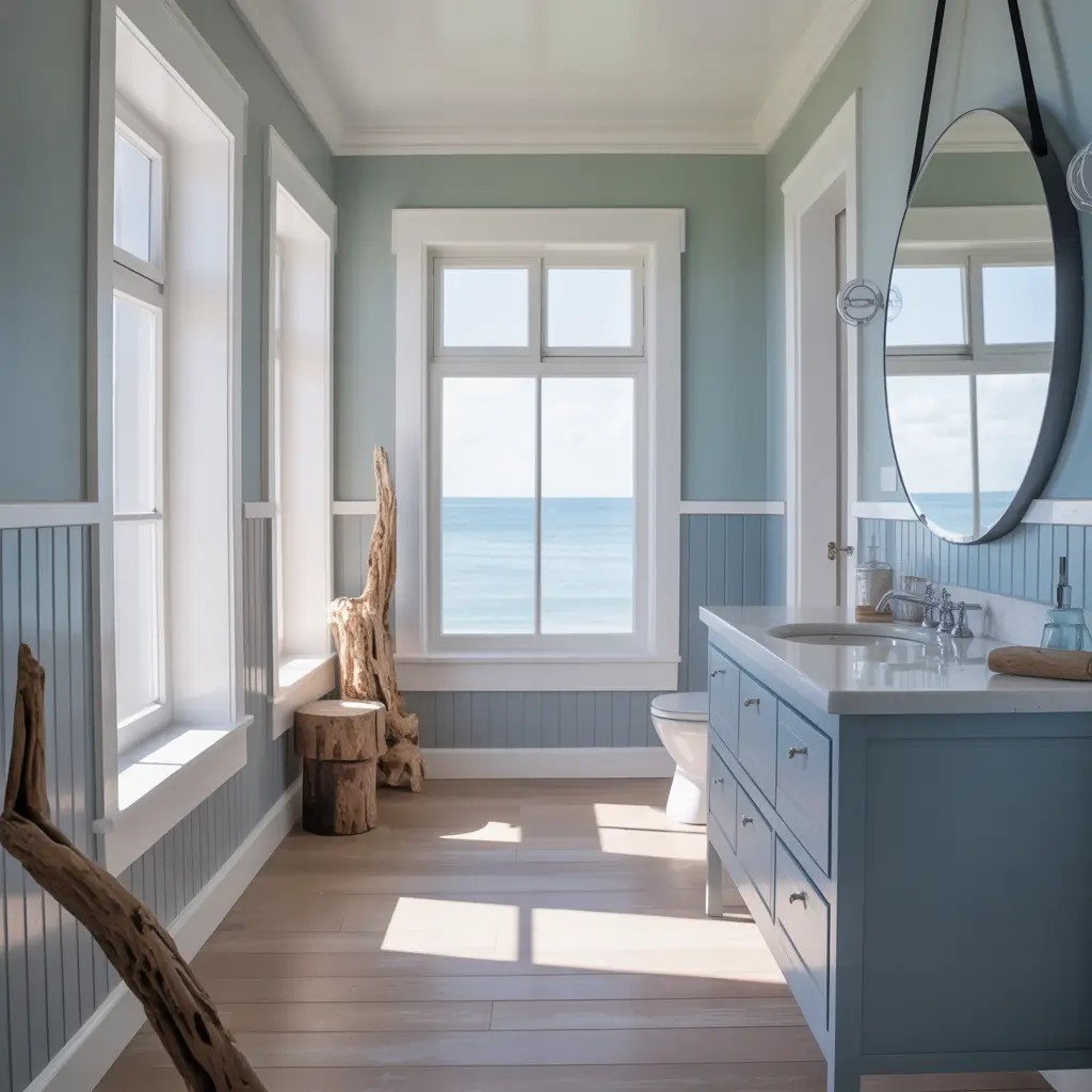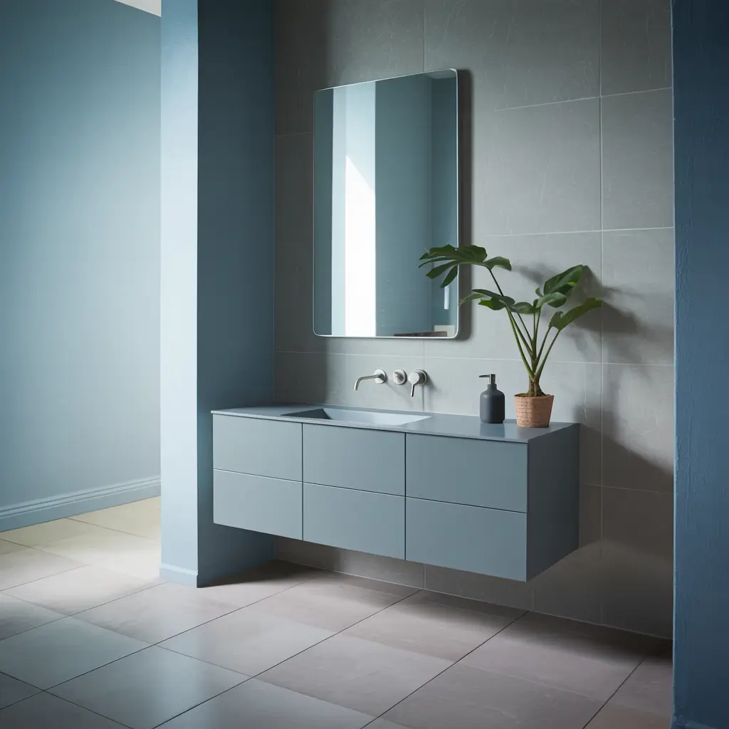 - Soft powder blue walls or tiles