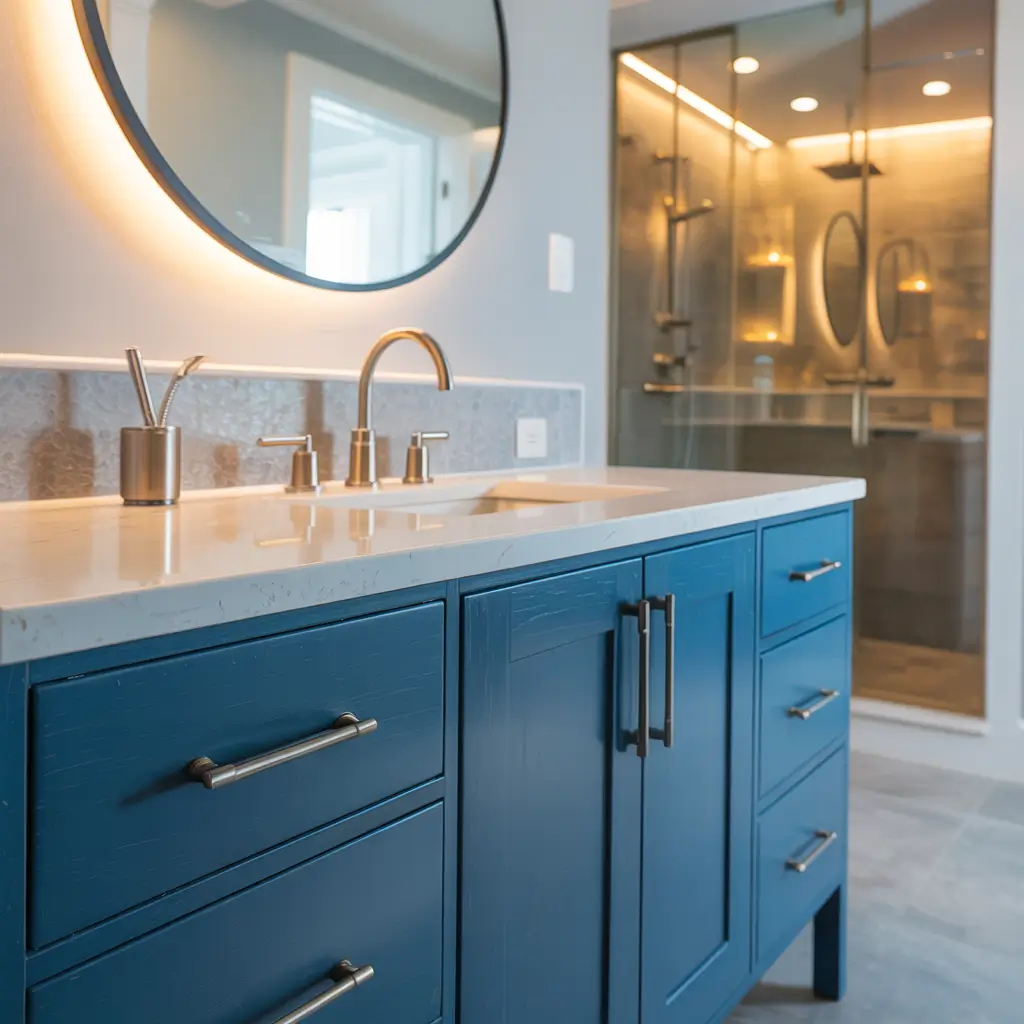 What works about blue and grey vanities is their versatility. They complement both warm and cool color schemes, work with any metal finish, and hide water spots better than lighter colors (trust me, this matters when you’re rushing in the morning).