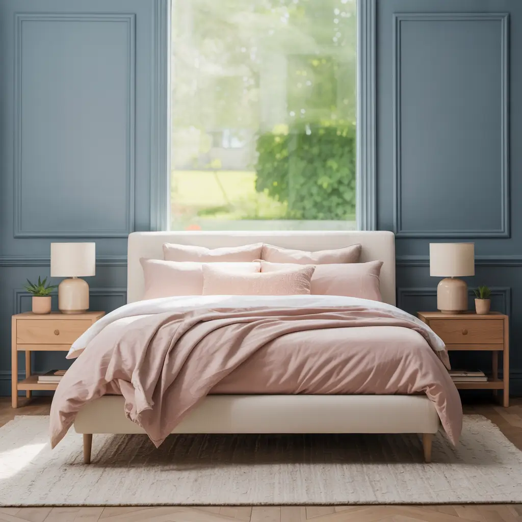The trick involves choosing a pink that doesn’t fight with the blue. Think dusty rose or mauve rather than hot pink. Your bed becomes the focal point without screaming for attention.