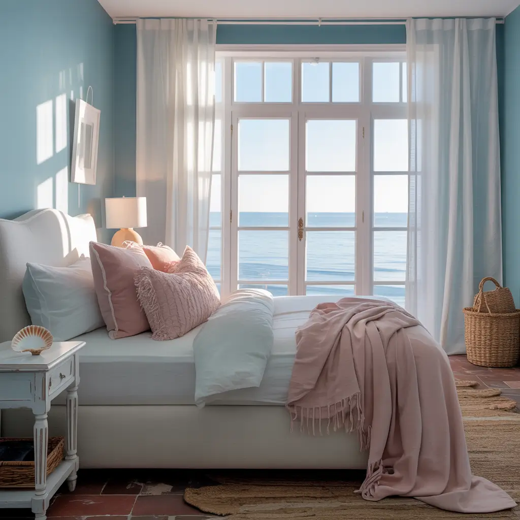 Coastal style doesn’t always mean nautical. Combining ocean blues with soft pink creates a beach cottage vibe that feels fresh and unexpected. Think of it as sunset colors meeting ocean hues.